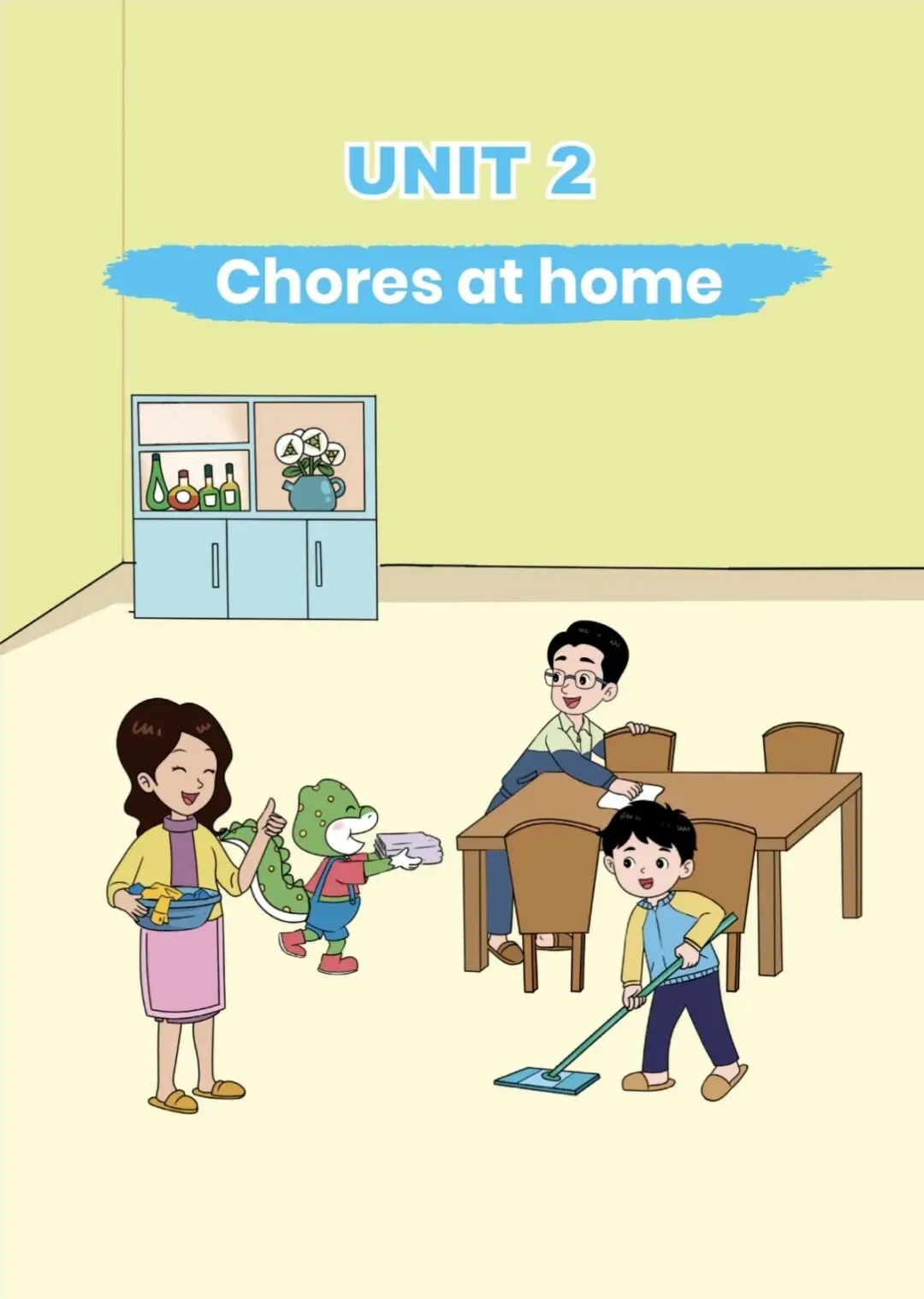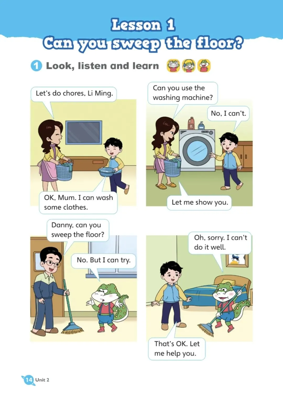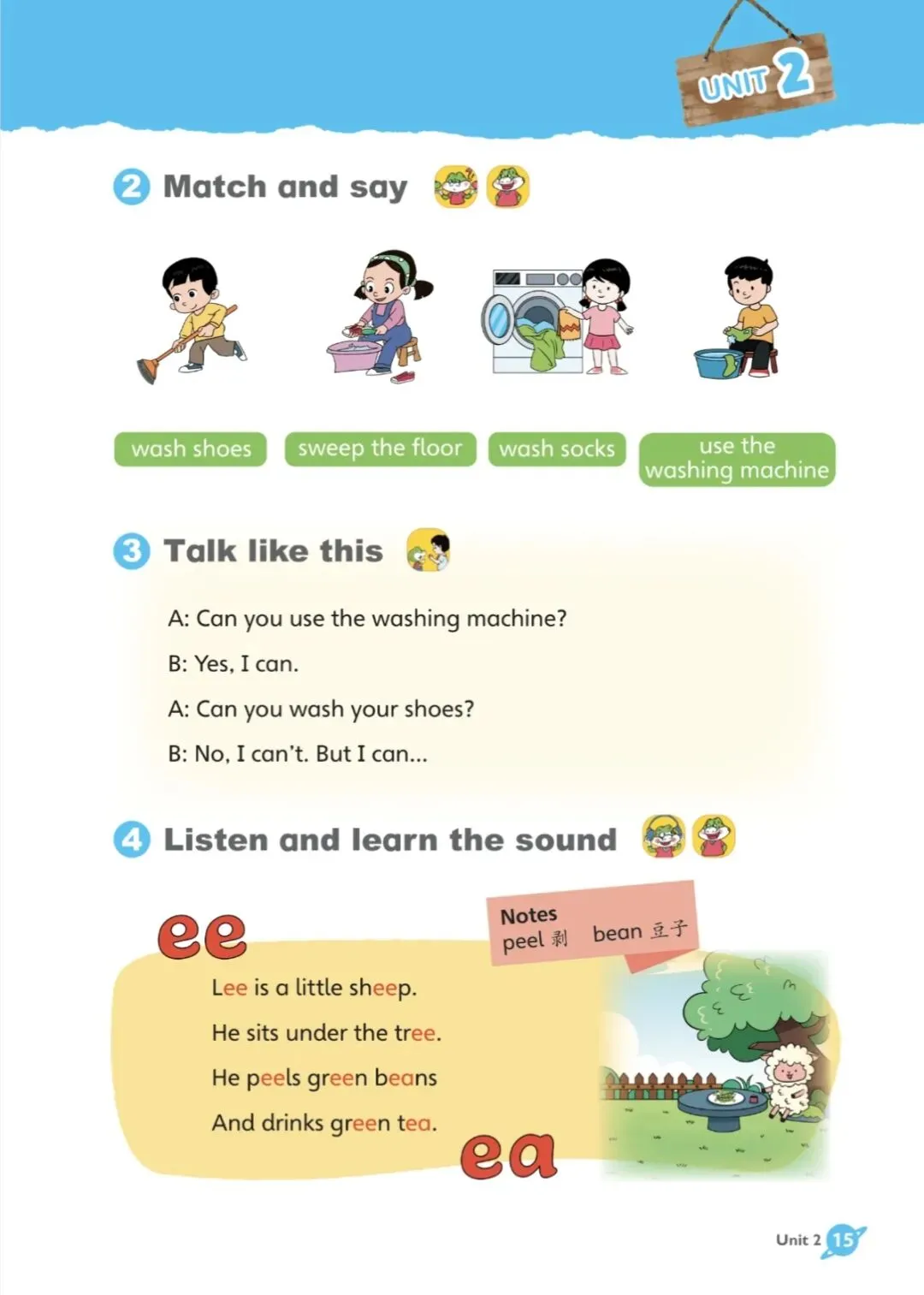 UNIT 2 Chores at home 第二单元 家里的家务Lesson 1 Can you sweep the floor? 第一课 你会扫地吗?①Look, listen and learn 看一看,听一听,学一学Let's do chores, Li Ming. 李明,我们做家务吧。OK, Mum. I can wash some clothes. 好的,妈妈。我会洗一些衣服。Can you use the washing machine? 你会使用洗衣机吗?Danny, can you sweep the floor? 丹尼,你会扫地吗?No. But I can try. 不会。但是我可以试试。Oh, sorry. I can't do it well. 哦,对不起。我做得不好。That's OK. Let me help you. 没关系。我来帮你。wash shoes 洗鞋子;sweep the floor 扫地;wash socks 洗袜子;use the washing machine 使用洗衣机A: Can you use the washing machine? A:你会使用洗衣机吗?A: Can you wash your shoes? A:你会洗自己的鞋子吗?B: No, I can't. But I can... B:不,我不会。但是我会……④Listen and learn the sound 听一听,学读音Lee is a little sheep. 李是一只小绵羊。He sits under the tree. 他坐在树下。He peels green beans. 他剥青豆。And drinks green tea. 还喝绿茶。免责声明:本音频、视频和相关素材来源于网络,仅供学习者免费使用,版权归原作者所有,如有侵权请联系删除!