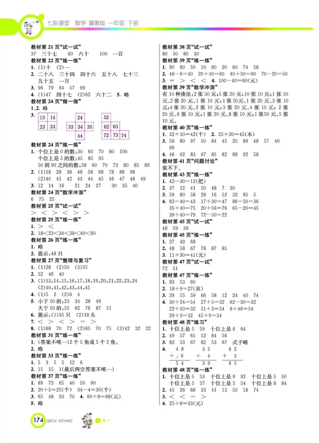 >小学教材习题答案一年级下册1年级下册冀教版数学课本参考答案冀教版