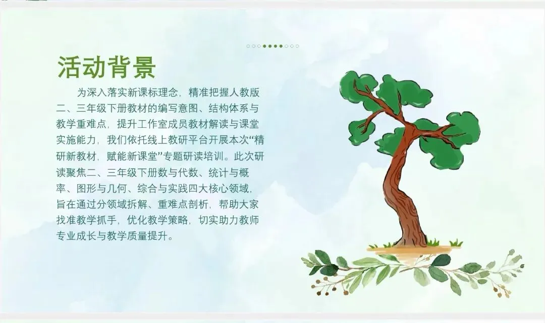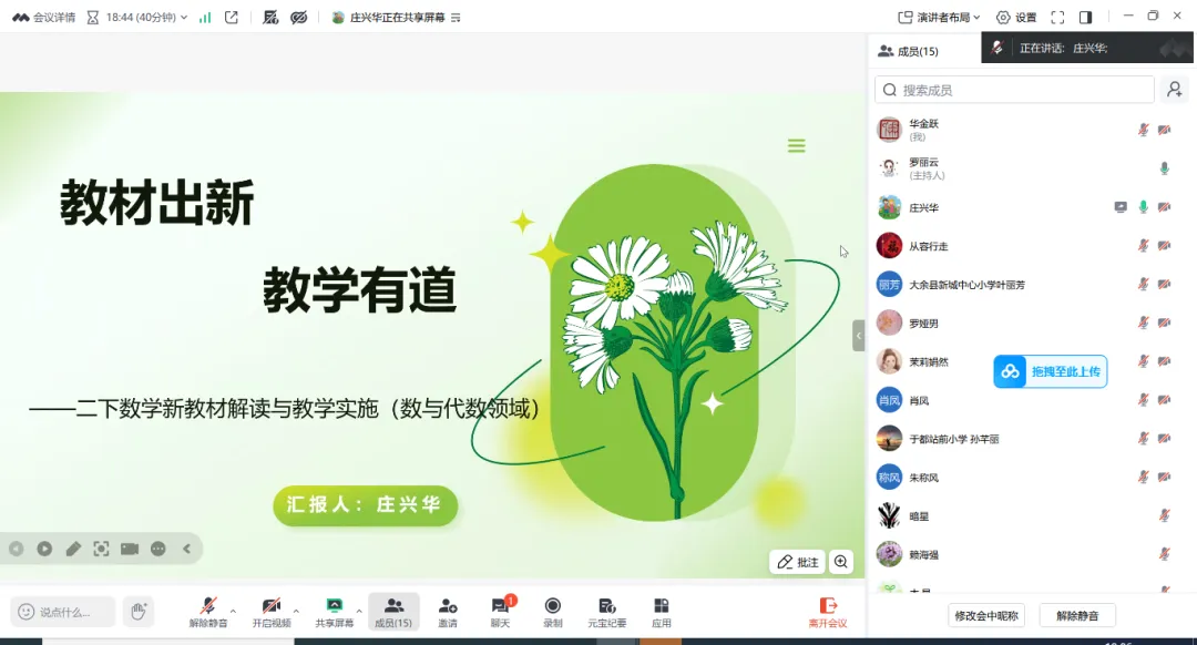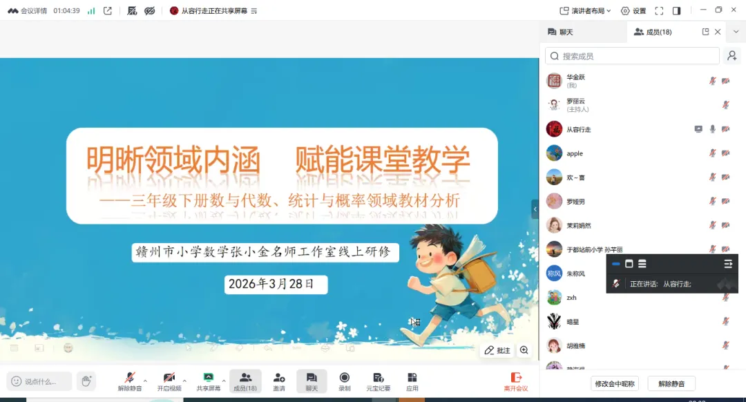 为深入落实新课标理念,精准把握人教版二、三年级下册数学新教材的编写意图、结构体系与教学重难点,助力教师提升新教材解读与课堂实施能力,2026年3月28日晚,赣州市小学数学张小金名师工作室依托线上教研平台,开展了“精研新教材·赋能新课堂”教材深度研读专题培训活动。工作室全体成员云端相聚,共研教材、共思教学、共促成长。