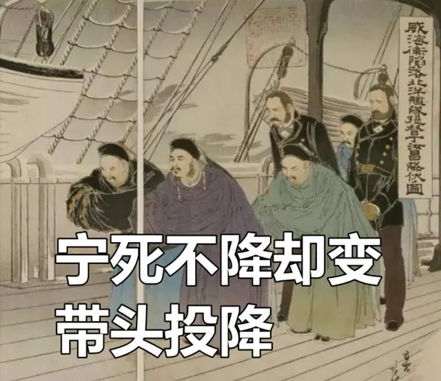 你别说,这幅画头一眼看去觉得是咱们风格的彩绘,细看看,不对劲,人物穿戴、神态、背景,全是那种外来的味道,这画出现在小学历史教材书里,下面一行小字写着“威海卫失陷,丁汝昌等人投降”,其实根本不是那么回事。这插图实则是日本明治时期画师画的浮世绘,原本就是他们夸耀打胜仗用的宣传画,现在却堂而皇之印在我们孩子课本上。这玩意放谁手里,不扎心才怪。