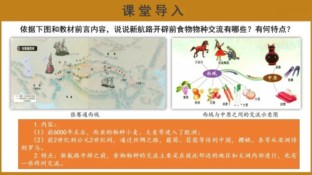 教师提问:依据图片和教材前言,说说新航路开辟前食物物种交流有哪些?有何特点?