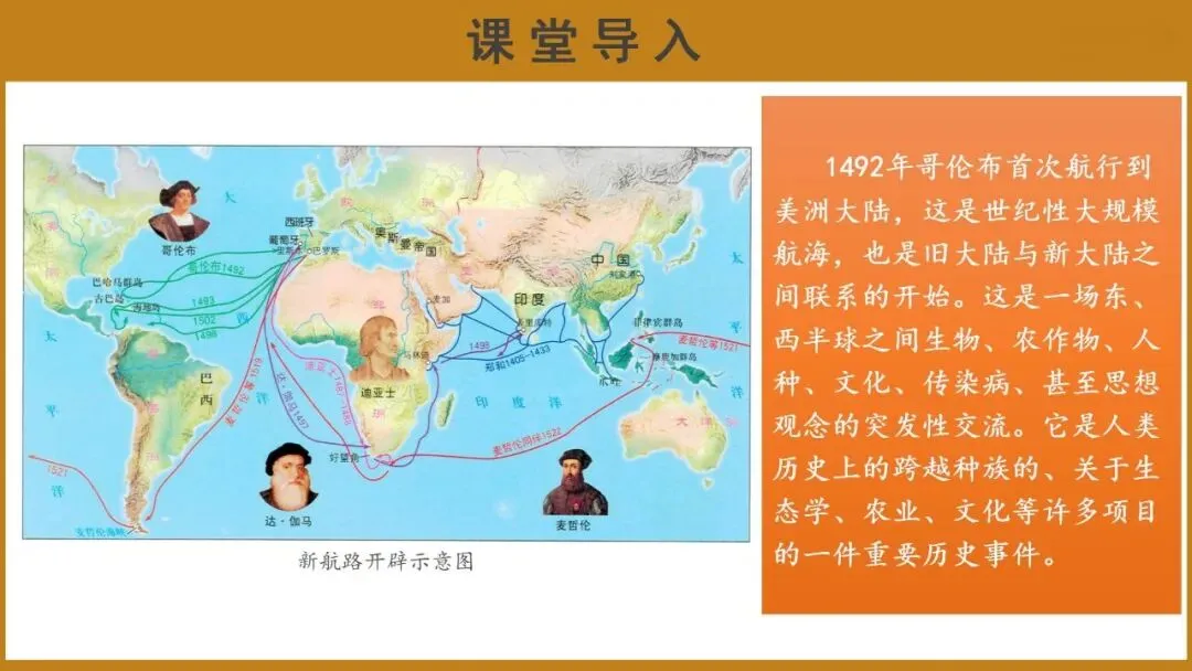 教师讲解:1492年哥伦布首次航行到美洲大陆,这是旧大陆与新大陆之间联系的开始。它是人类历史上一件重要历史事件。新航路开辟后,在欧洲开展殖民活动的同时,人口、动物和植物在殖民者的主导之下,得以获得全球性的交流,欧洲开始从世界各殖民地那里引进各种新的食物物种。与此同时,欧洲人将本土的一些动植物带到殖民地,进行物种改良。具体物种交流情况如何?今天我们便来一起学习这部分内容。