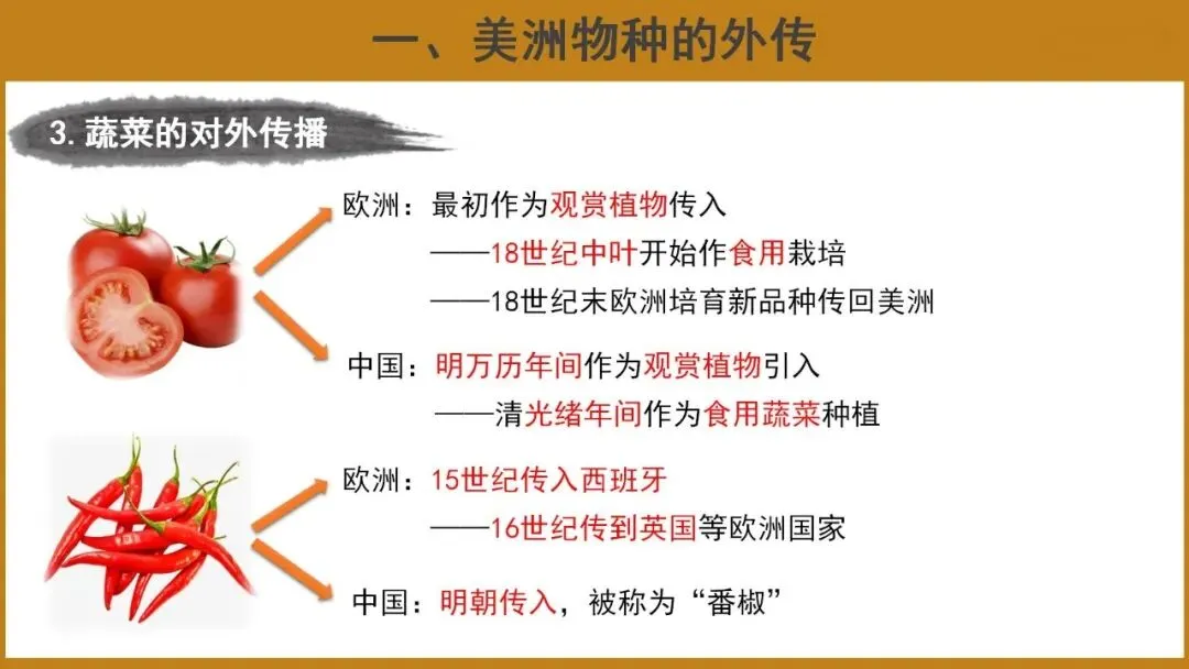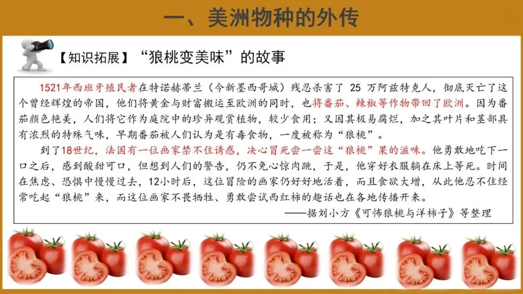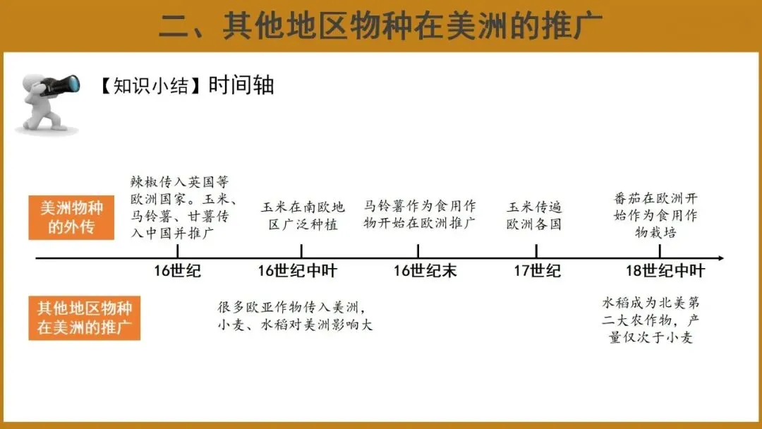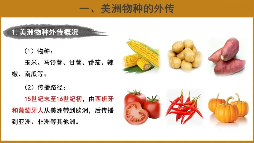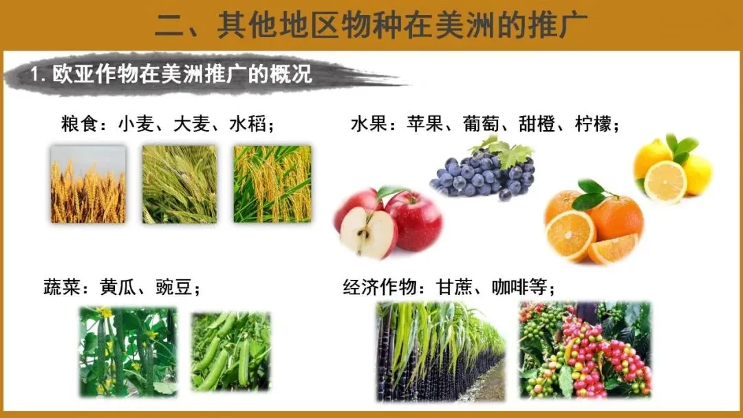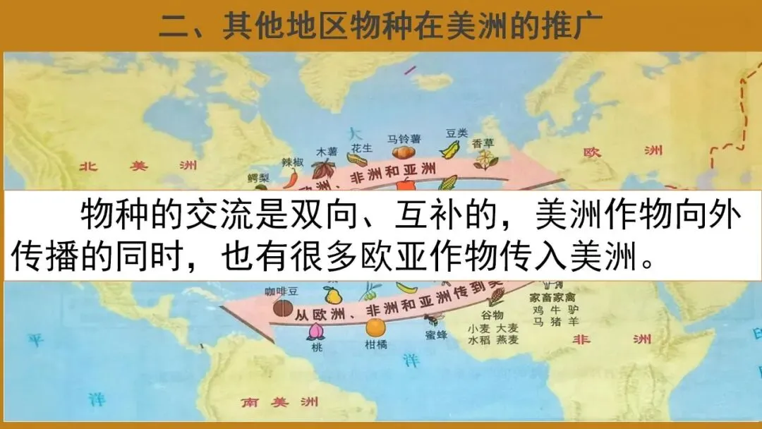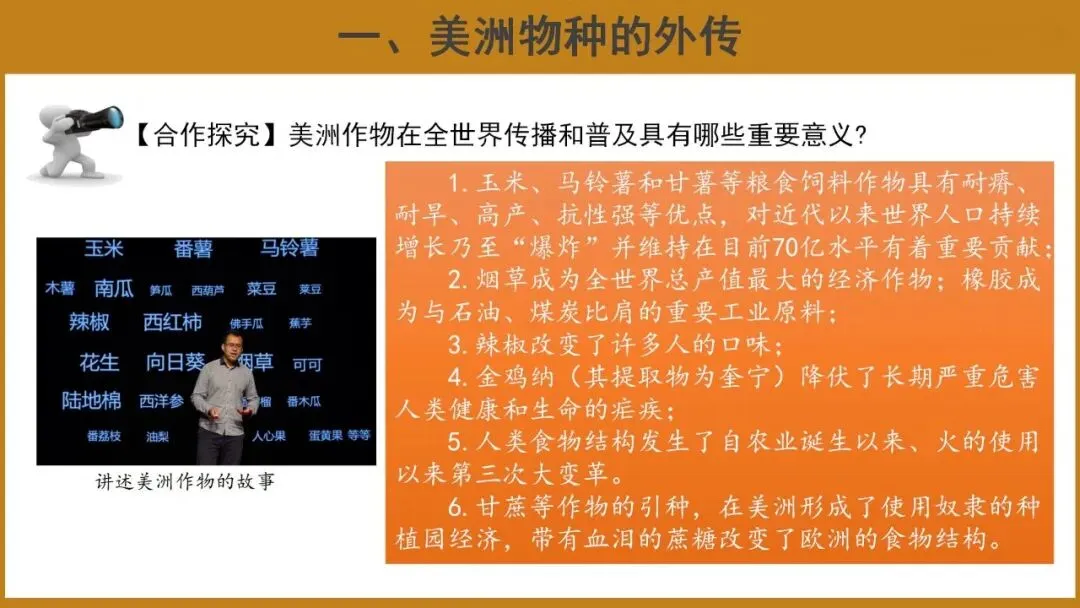 教学重点:了解美洲食物物种外传和其他地区物种在美洲的推广概况;