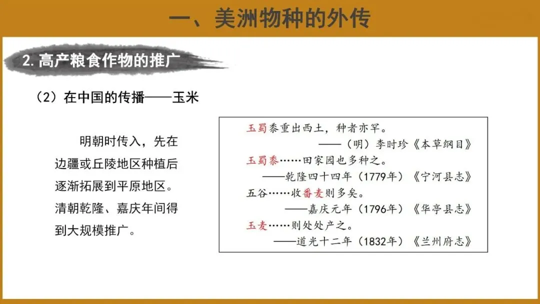 3.通过阅读史料中,有效提取“明清时期玉米在我国种植情况的变化”、“甘薯是如何传入中国并在中国大量种植的原因”等信息,提高学生的史料实证能力;