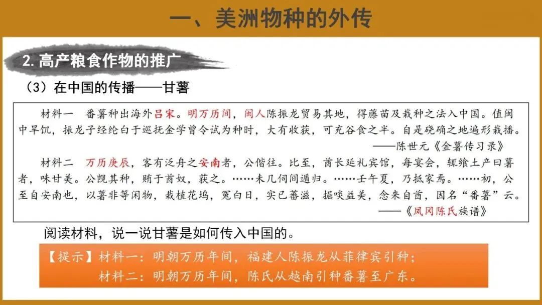 材料二:明朝万历年间,陈氏从越南引种番薯至广东。