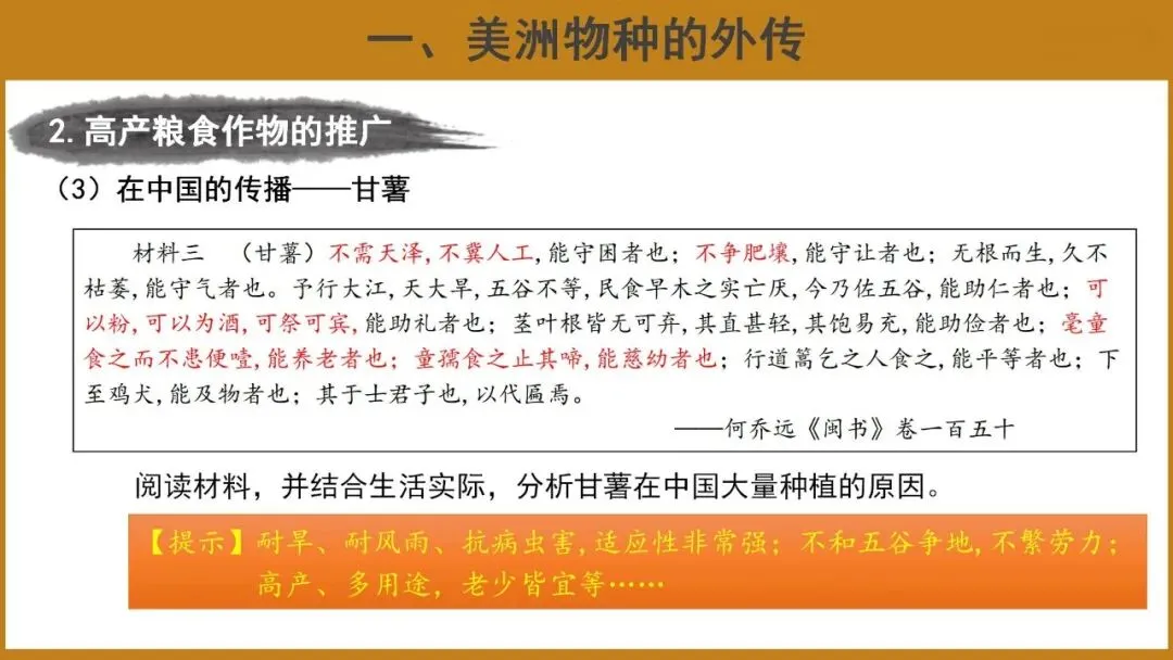 【想一想】依据材料,说一说甘薯是如何传入中国的。并结合生活实际,分析甘薯在中国大量种植的原因。