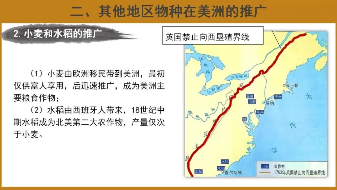(2)水稻由西班牙人带来,18世纪中期水稻成为北美第二大农作物,产量仅次于小麦。