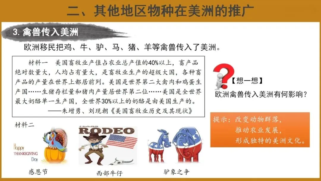 【想一想】依据材料并结合所学,欧洲禽兽传入美洲有何影响?