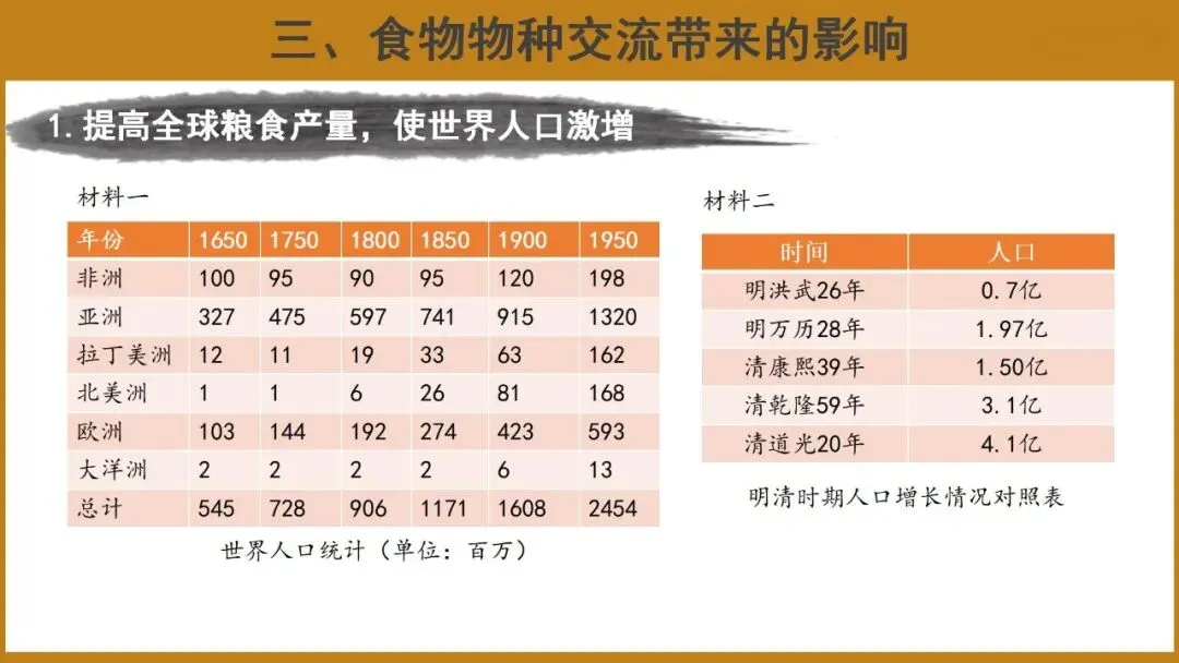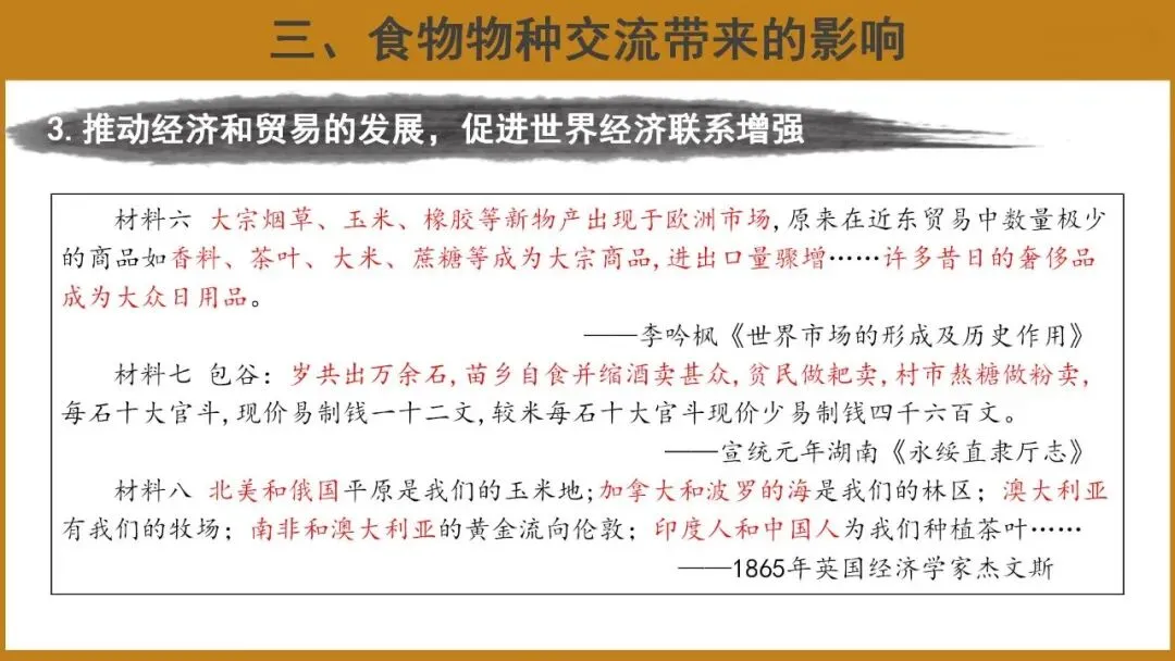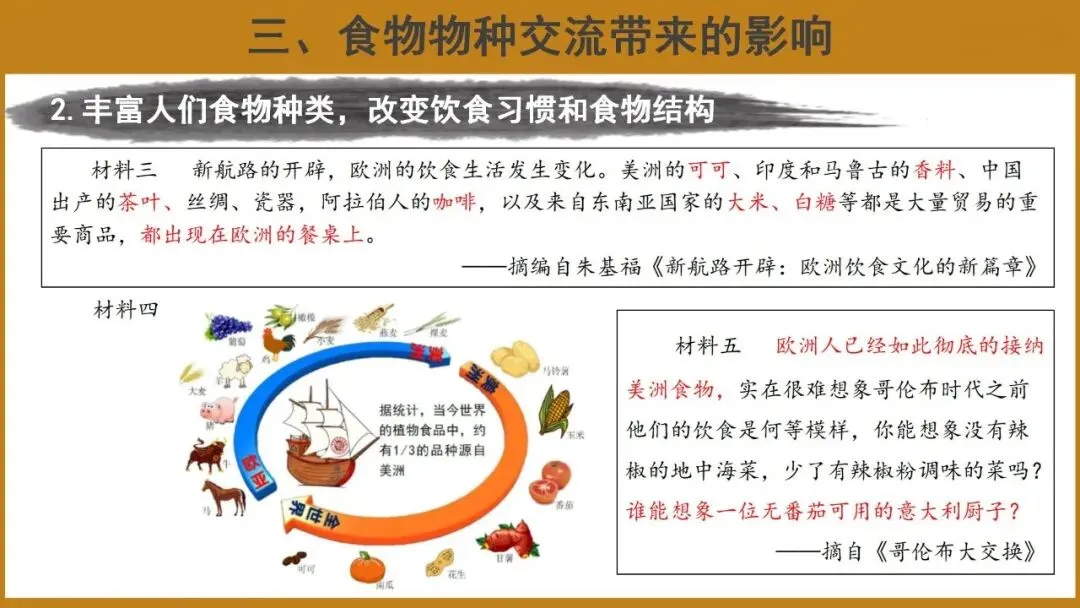 过渡:新航路开辟后,在欧洲人的主导下,丰富多样的食物物种交流遍及全球。这种交流在经济发展、社会生活、环境问题等多方面产生了巨大深远的影响。