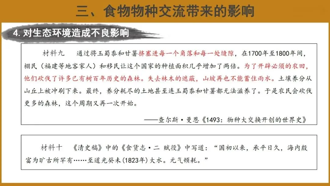 教学难点:分析食物物种交流带来的影响;结合当今外来物种入侵的现实,反思其危害与应对问题。