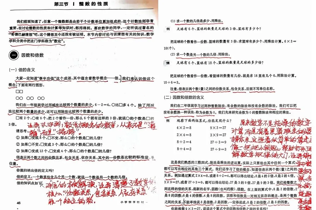 因数和倍数是整数性质的基石,也是学生接触的第一个抽象数量关系。教材从“倍”的含义入手,巧妙地引入“事半功倍”这一成语,并结合直观的图形对比,让学生在熟悉的生活情境中初步感知“份数关系”,再自然过渡到因数与倍数的抽象定义。这种从“直观感知”到“抽象定义”的设计思路,精准契合了中低年级学生从具体形象思维向抽象逻辑思维过渡的认知规律。读到这里,我深刻意识到,教学中切忌急于抛出干瘪的概念,而应像教材那样,精心设计“摆一摆、分一分”的操作活动,让学生在动手实践中亲历知识的形成过程,真正理解“因数与倍数相互依存”的本质,从而避免机械记忆带来的认知偏差。