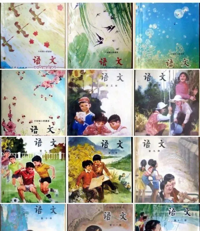 这一张最有意思的地方,是你会发现以前的语文书封面,真不是随便画画。燕子、花枝、蓝天、孩子、田野,颜色柔和,画面安静,不像教材,倒像一本薄薄的画册。小时候拿到新书,很多人第一件事不是看课文,而是先翻封面、看插图,闻那股油墨味。说实话,这个习惯现在想想还挺讲究的。那时候书不多,一本语文书能翻来翻去看好多遍,连封面角卷起来了都舍不得丢。