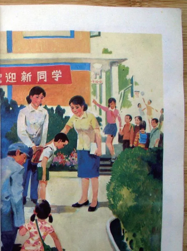 这张开学场景,真有那个年代学校的味道。校门口挂着红底白字的横幅,老师站在门口迎学生,孩子背着书包,规规矩矩地排着往里走。你再看人物动作,小男孩还微微鞠躬,老师弯下腰接一下,那种入学的郑重感,今天已经很少见了。以前上学,开学真像过节,家长帮着整理书包,孩子穿得干干净净,心里装着一点紧张,也装着一点高兴。