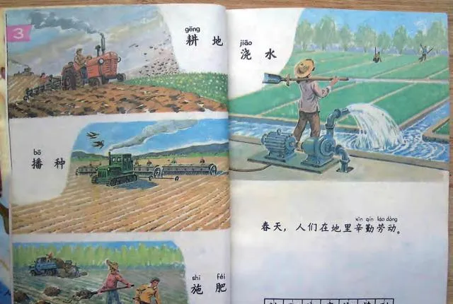 这页一翻开,年代感一下就出来了。拖拉机、播种机、抽水机,还有田里扛着锄头的人,画得很直白,也很认真。以前的课本里,劳动不是一个空词,它是有画面的。孩子一边认字,一边就知道**“耕地、播种、浇水、施肥”**到底是怎么回事。现在再看,会觉得那时候的教材真接地气,字词不是飘着的,都落在土地上。