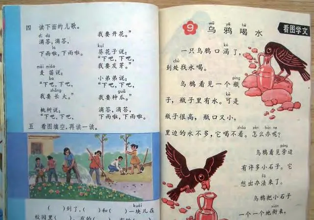 很多人小时候都背过这篇吧。可这张图真正让人记住的,不只是故事,而是那个瓶子。细口长瓶、几颗小石子、两只黑乌鸦,画得特别醒目。小孩子看这种图,理解一下子就进去了。以前总说老教材图文并茂,这四个字不是白说的。你看一眼,脑子里就有画面,课文也就顺着记住了。你小时候学这篇时,是先记住乌鸦,还是先记住那个瓶子?