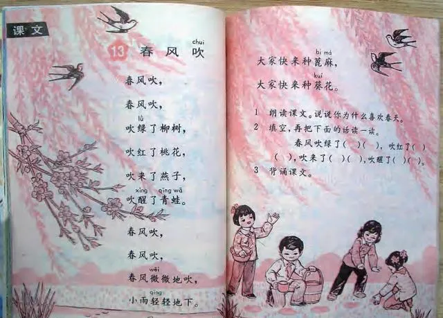 这一页是粉红色调,燕子飞着,柳枝垂着,几个孩子提着小桶、拿着小铲子,像是刚从春天里跑出来。那个画风现在看有点朴,但特别耐看。以前的儿童插图,不追求花哨,反而有一种轻轻的、柔柔的美。尤其这种儿歌课文,读起来朗朗上口,画面又跟着文字走,“春风吹,吹绿了柳树,吹红了桃花”,小时候还不懂什么叫审美,先被这些图悄悄带进去了。
