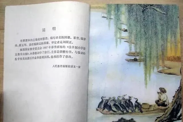 这张不热闹,却很耐看。左边是说明文字,右边是一幅水边小景,柳枝垂下来,船头停着鸬鹚,岸边还有戴斗笠的人。它不像课文页那么直接,反倒多了一点安静的味道。以前的语文书里,经常藏着这种页码前后的小插画,不声不响,但你多年后还能记得。别看只是个过页,那个年代的美术功底,还真不含糊。