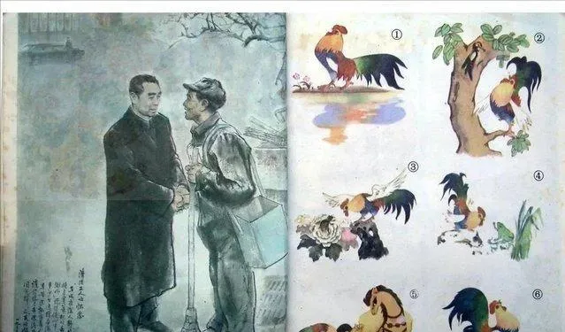 这一张挺有意思,左边是人物画,右边是公鸡的不同姿态。放在今天看,可能有人会觉得有点跳,但小时候完全不会觉得奇怪。语文书就是这样,既有人物故事,也有认图识物,内容不拐弯,特别直接。那只大公鸡颜色鲜亮,姿态各不相同,孩子看了很容易就记住了。以前教材里的图,不怕“土”,却特别好认。