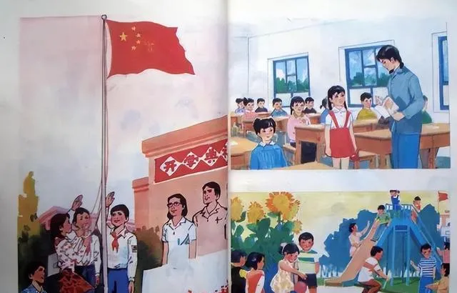 这页很像那个年代学校生活的缩影。左边是升旗,右边是老师上课、孩子们做游戏。你会发现,那时候画里的孩子穿得很朴素,红领巾却特别显眼。老师站在讲台边,学生坐得端正,窗户开得大大的,光线也亮堂。以前校园生活没那么多花样,可秩序感很强。读书、劳动、做操、升旗,日子一天天过去,简单,但很扎实。