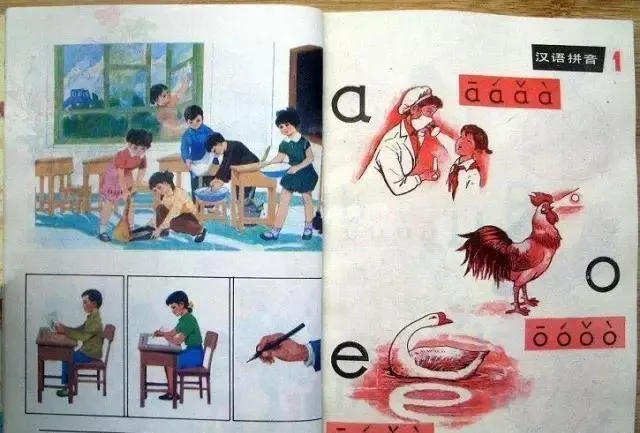 看到这一页,很多人估计会下意识跟着念出来:a、o、e。这几个字母,真像刻在一代人的脑子里。旁边的公鸡、白鹅、阿姨和小朋友,也都是最经典的启蒙画面。以前学拼音,靠的就是这种最直观的图配音,没有电子屏,没有动画,但记得特别牢。直到今天,有些人一看到这页,嘴里还是会自动往外蹦读音。