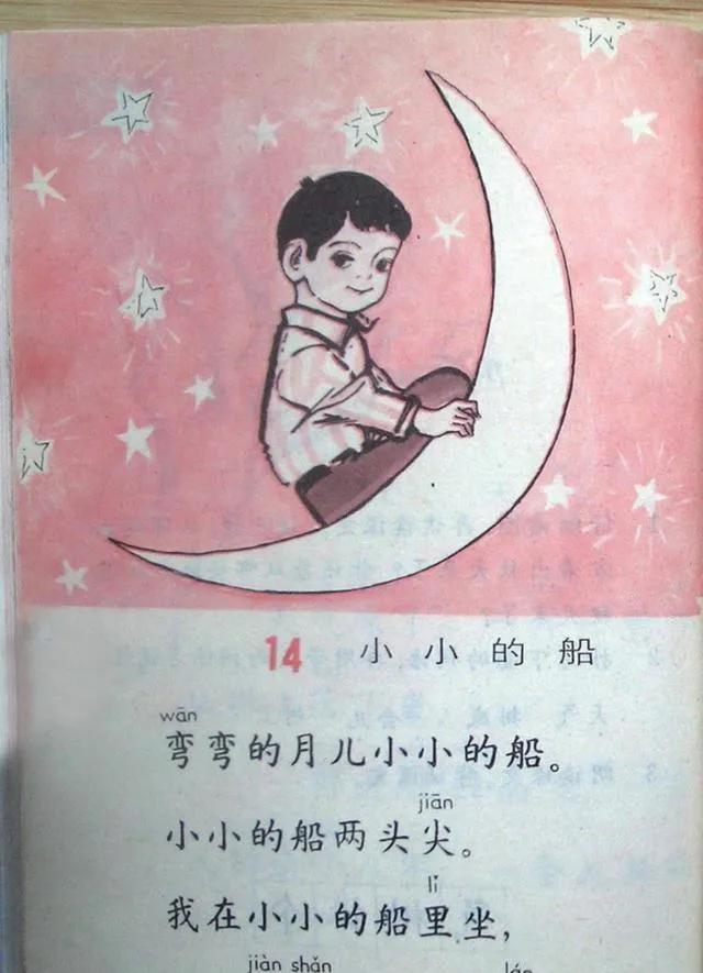 一边是《八角楼上》,一边是《小小的船》,放在一起看很有意思。前者安静、沉稳,一盏灯、一张桌子,气氛一下就压下来了;后者却是粉色底,一弯月亮,一个孩子坐在上面,满页都是星星。小时候读到**“弯弯的月儿小小的船”**,很多人第一眼先记住的不是字,而是这幅图。甚至有孩子没学课文前,看图还会瞎猜。现在回头想,那种想象力,真是课本一点点喂出来的。