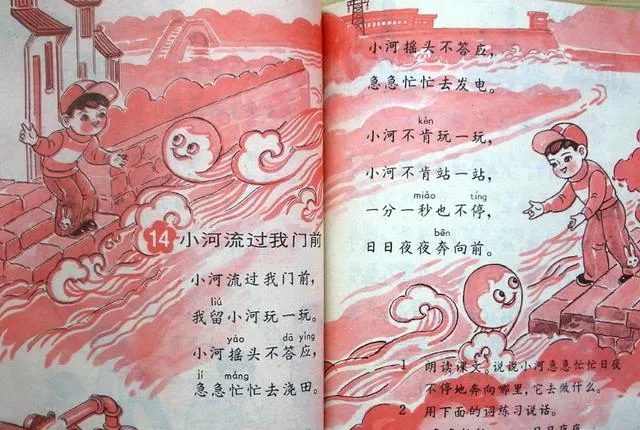这类红色单色印刷的插图,现在已经很少见了。小孩站在河边,水纹是卷起来的,像云,也像浪,带着一点夸张感。可小时候特别吃这一套,觉得它生动。课文里写小河不停往前流,人也是跟着往前走。现在再看,这种图未必精细,却很有记忆点。老教材最厉害的地方,就是它总能让你隔很多年还想得起来。