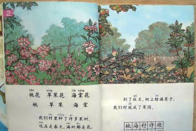 后面这几张,一个是劳动丰收场面,一个是《春天》、花果树木的彩图。麦田里的人弯着腰忙活,河边春水化开,桃花、苹果花、海棠花一层层铺开。以前的语文书,真不只是教认字,也在教孩子认识季节、认识土地、认识生活。那时候我们也许不懂这些画为什么好看,只觉得愿意翻,愿意盯着看。等年纪慢慢大了才发现,真正让人怀念的,不只是课本本身,还是围着课本转的那些日子:新学期包书皮,课间翻插图,背课文背得头大,放学路上还在嘴里念。