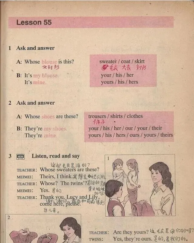 那套教材里,双胞胎Lucy和Lily混在一起,老师点人说“谁会分清楚”,平时谁都挤在一起闹腾,一到问答场面,倒变得一本正经。班里真有兄妹的,还给自己起外号,我妹妹那时候也跟着写“my blouse, my skirt”,不知道的还以为家里真有对外国亲戚。你要说趣事,Lucy和Lily争衣服那段,总被大家拿出来开玩笑,“这是你的那是我的”,就跟早晨抢早餐一样热闹。