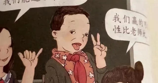 先瞧瞧图里头那个小男孩,穿着红领巾,满脸是没睡醒的小细眼,嘴巴还裂着个大口子,做个鬼脸的神态,一副吊儿郎当的样子,这形象一出来,难受的不是一个人,两眼夹条线,表情没精打采,不知道的还以为这是外国画家笔下“亚洲娃娃”老一套的套路,可这明明写着给中国小学生看的东西,咋偏偏要把孩子画成这样呢。