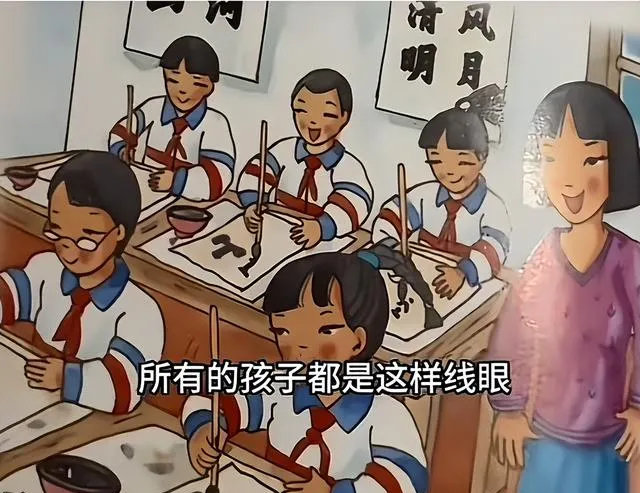 最离谱的是,翻到那个教室的画面,全班孩子都这么画,刷刷一排排白衣红领巾,手里的毛笔举着,全是那种“线条眼”,看得人心里瘆得慌,这要是拿给没见过国人的外国人看,还真以为中国人眼睛就只剩这根缝,咱小时候画画还画点神采呢,这玩意越看心火越大。