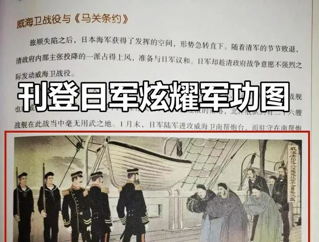 图中这一页可不是啥美术教材,这叫“日军炫耀军功图”,明晃晃印在小学生历史课本里,四五个穿水手服的日本兵,前头几个清朝官员低着头挨训似的,右上角小楷写着“威海卫降服”,谁拿这个做主了,直接拿日本明治年间自编自画的浮世绘当做史实图例,这玩意看着眼熟,其实当年就是日方炫耀甲午战功,宣扬对中国的“降服”,哪有丁汝昌主动投降这一说,老人家早就是宁死不屈,结果小学生刚学历史,翻开书就看见“大清带头磕头”,这不闹心么。