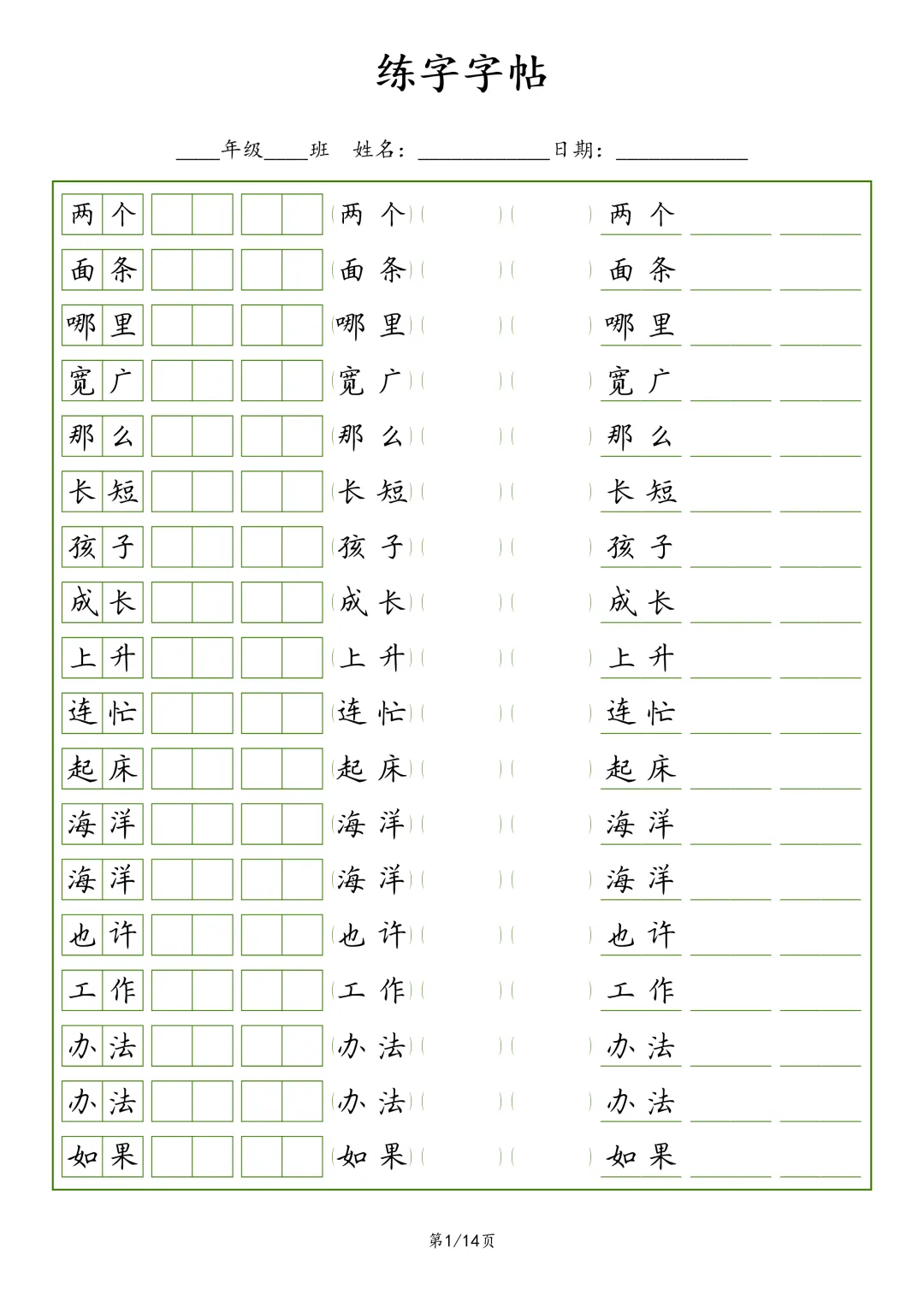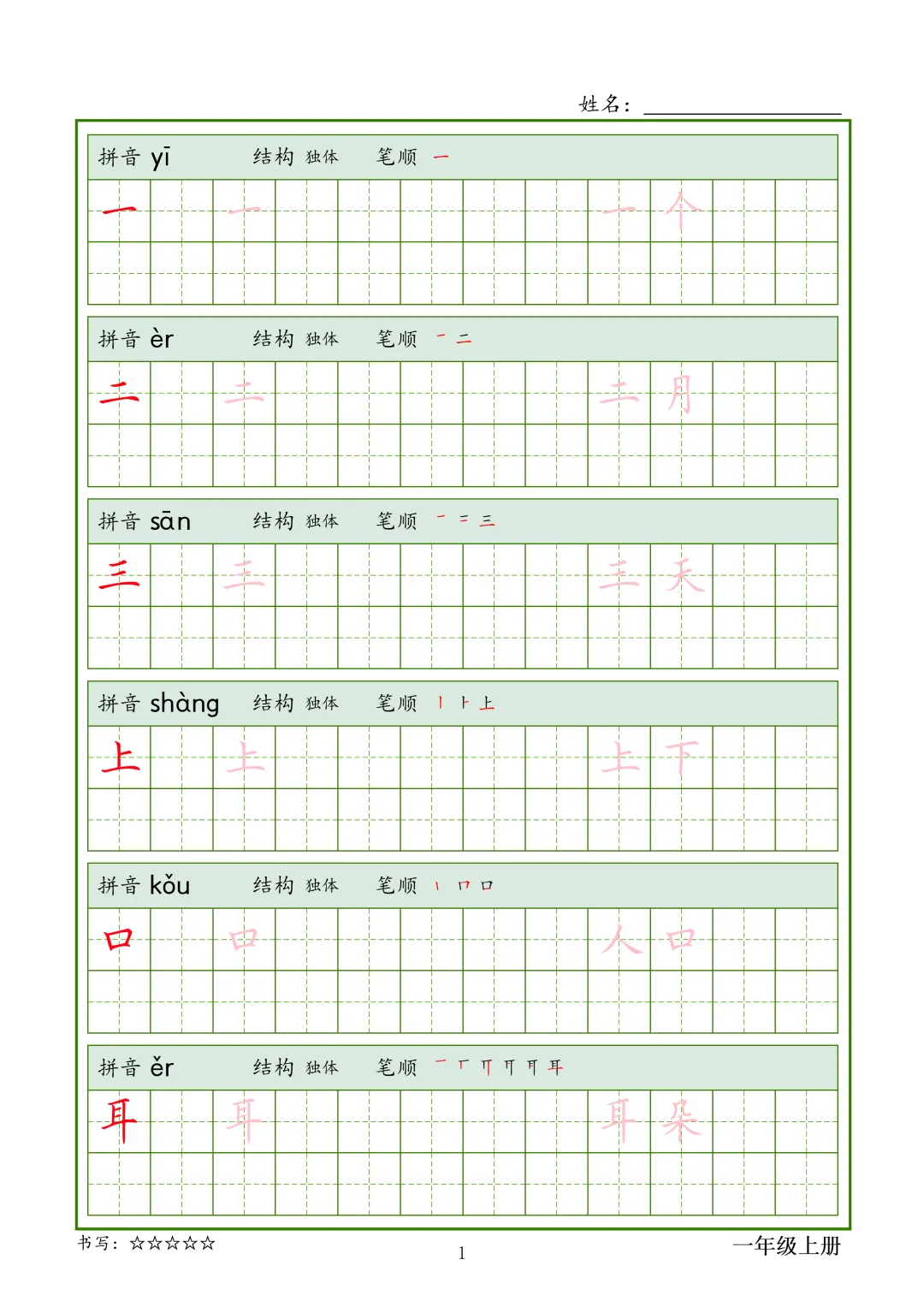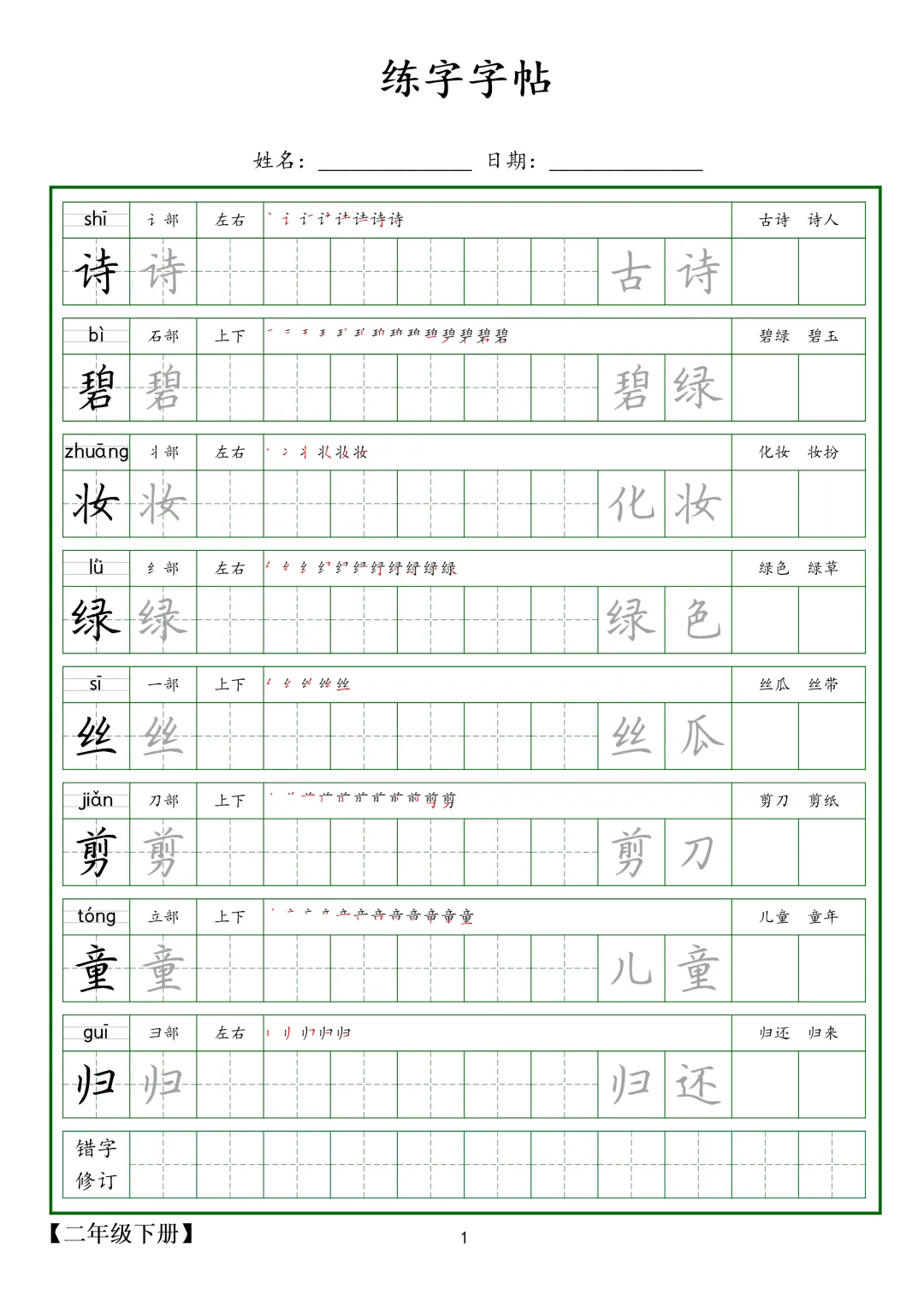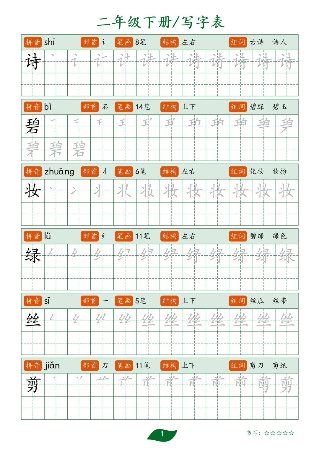 【G-1款绿格】1-6年级生字字帖pdf电子版