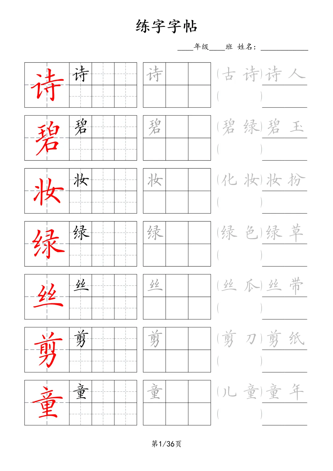 【J-C款】1-6年级生字字帖pdf电子版(含看拼音写词语)