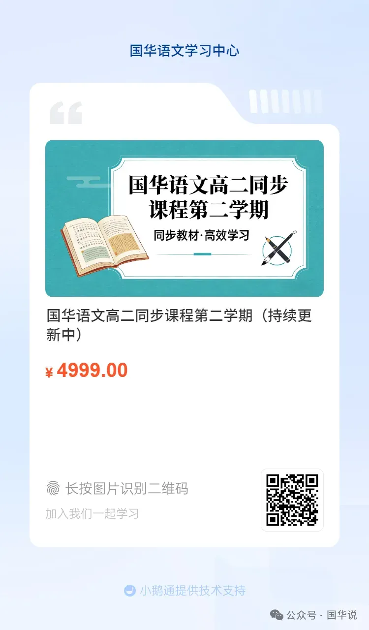 以上是我高中同步课程的部分内容和课程讲义,题目也是我原创命题,国华语文高中同步课,既专注文本细读,又做足教考衔接,让语文课堂在回归语文味的同时,实用于高考,让教师教的轻松,学生学的有趣。想要加入语文研讨学习群,与天下同行同道共商语文的老师同学加微信qiaohuohua: