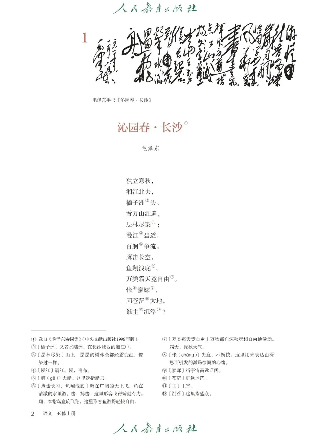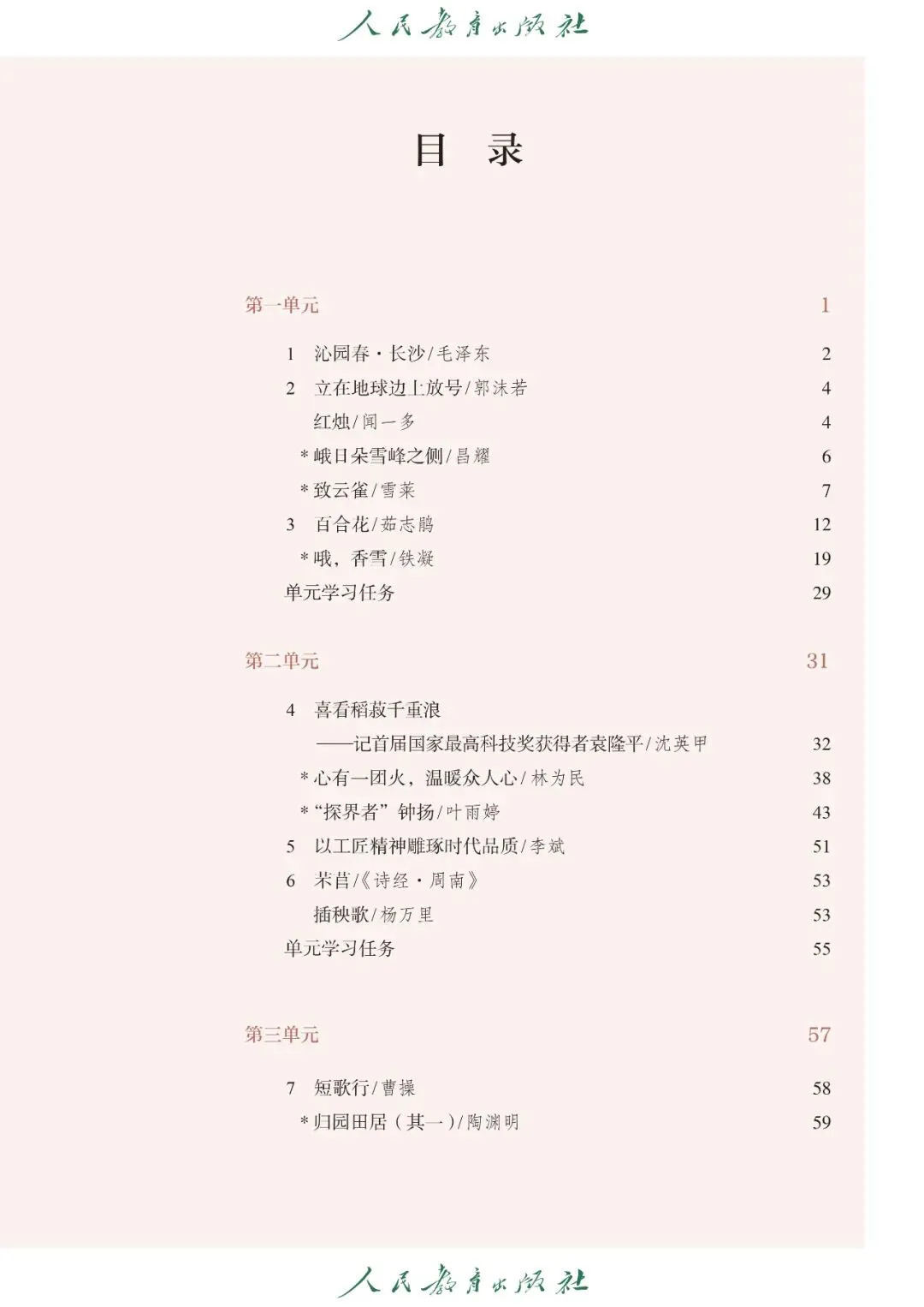 【1】第一单元:主要内容包含课文《沁园春·长沙》《立在地球边上放号》《红烛》《致云雀》《峨日朵雪峰之侧》《致大海》,核心内容有现代新诗鉴赏、意象与情感分析、诗歌语言与表达技巧、青春与理想主题理解
