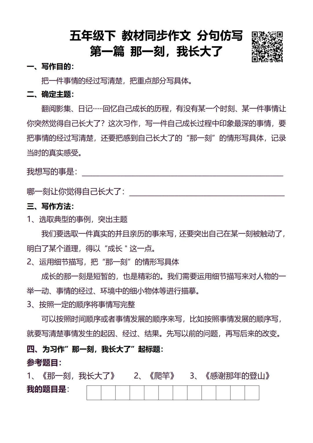 大家好,我是安妈,每天持续分享小学1-6年级全科学习资料。今天和大家分享的是2026年春小学五年级下册语文教材同步作文、句子仿写电子版可打印。