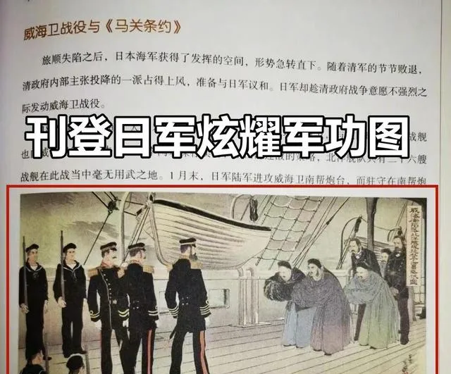 这个图说实话一看就别扭,里面穿制服的人笔挺着站,几个中国官员哈着腰鞠着身子,只有边上小字写着**“威海卫陷落,北洋舰队投降”**,看起来有模有样,偏偏一细琢磨,这不是日本明治年间专门画来宣传自己“打赢中国”的浮世绘咯,这幅画的路数就是让人心里不服气,爷爷在边头看了一眼,“哪有丁汝昌带头投降的道理,他宁死也不会低头”的话还在我脑子里转圈,那会课本写的全是将军守卫不屈,如今小孩翻本书,看到的是敌人画的吹嘘场面,谁看了不心堵。