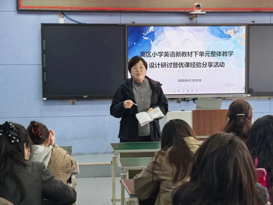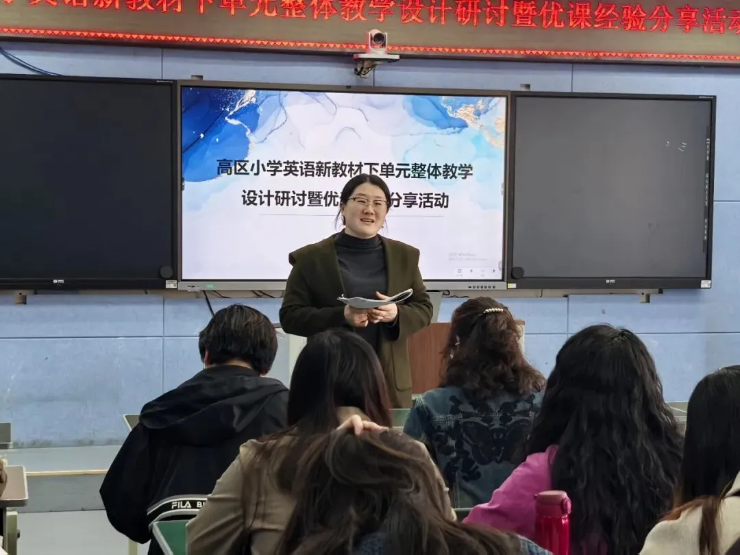 最后,高区小学英语教研员对活动进行了总结,她对两节课例进行了高度评价,同时也就单元整体设计、课堂精准教学、课堂评价、校本教研等方面提出新要求。高区小英团队将继续以“单元整体教学”为重要抓手,深化课堂研究,聚力资源建设,共同推动区域小学英语教学质量的稳步提升,迈向更加生动、高效的教学新样态。