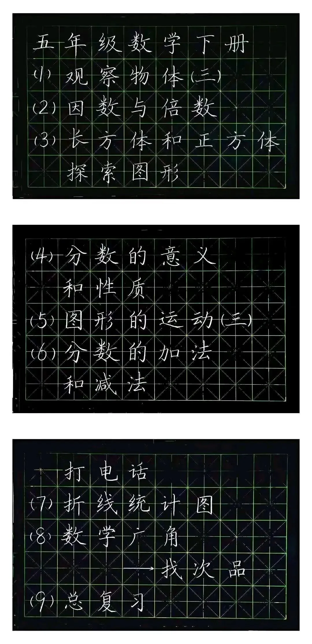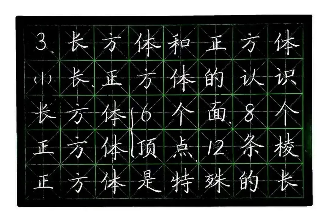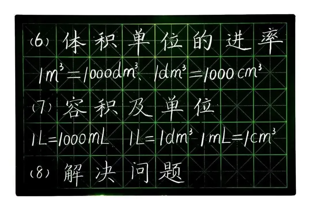 一名退休的60后,粉笔板书不易,整理亦不易,请坚持看到最后!本系列板书模板基于老人教版小学数学教材编写,旨在为老师提供规范的教学板书参考。无论教材版本如何更新,核心知识点始终保持稳定——这些基础概念是学生必须掌握的,知识本身具有永恒作为一线数学老师,我受市教科室于江美科长委托创作此系列,在有限时间内完成了这项较大工作量的任务。书写过程仓促,难免存在笔迹或排版瑕疵,恳请各位同仁海涵,包容这份非专业书法的粗糙,专注于教学本质。| 五年级数学下册 |