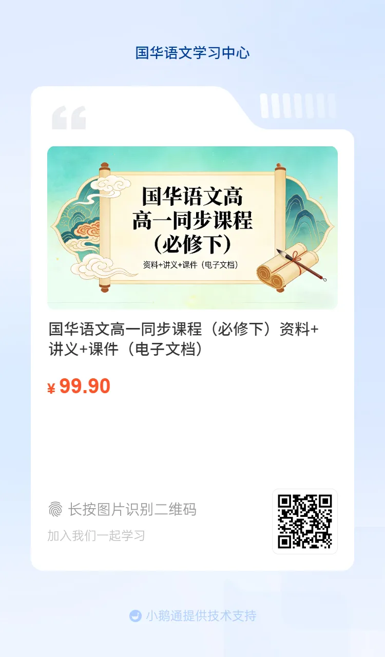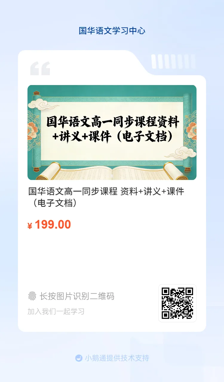 以上是我高中同步课程的部分内容和课程讲义,题目也是我原创命题,国华语文高中同步课,既专注文本细读,又做足教考衔接,让语文课堂在回归语文味的同时,实用于高考,让教师教的轻松,学生学的有趣。想要加入语文研讨学习群,与天下同行同道共商语文的老师同学加微信qiaohuohua: