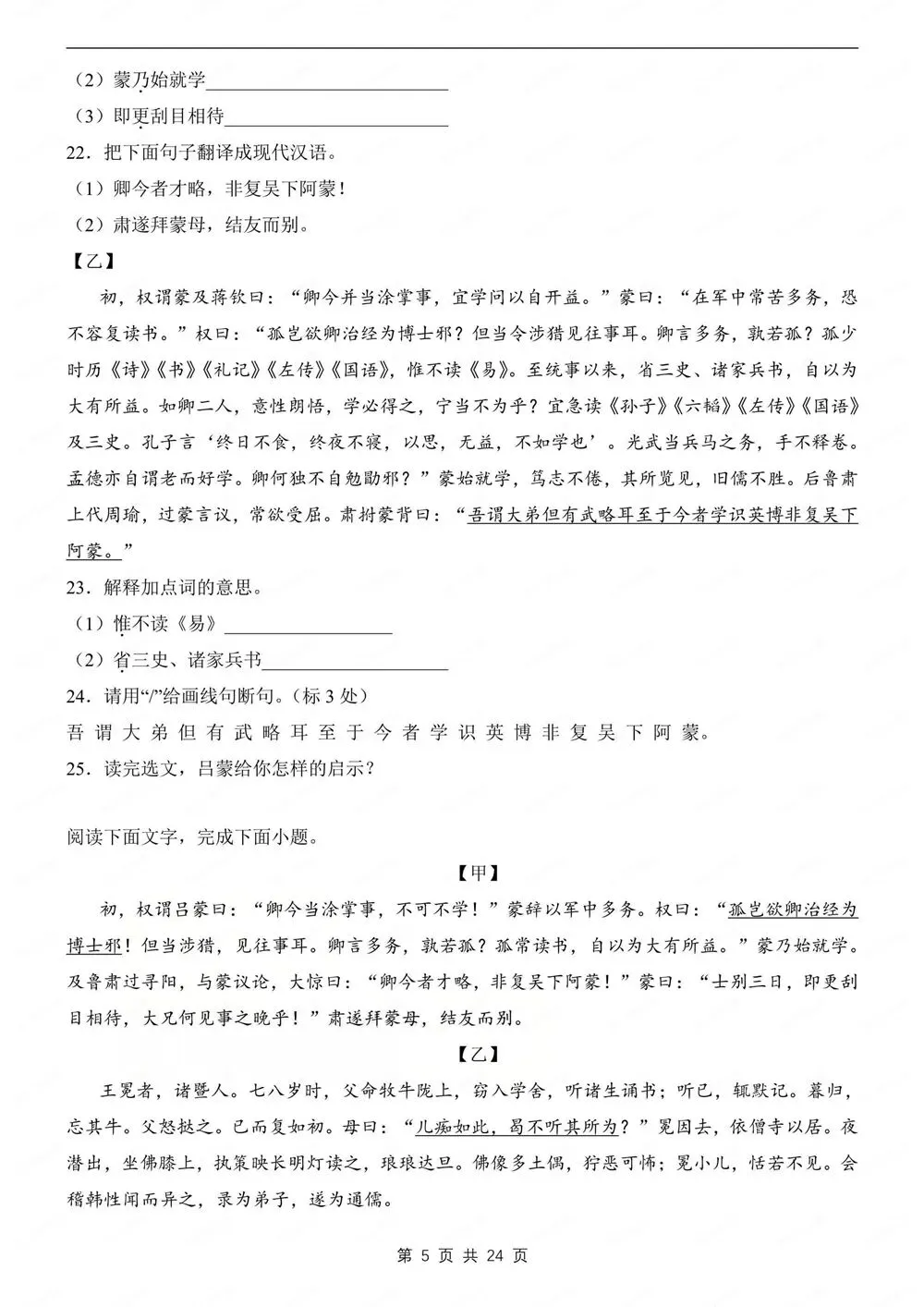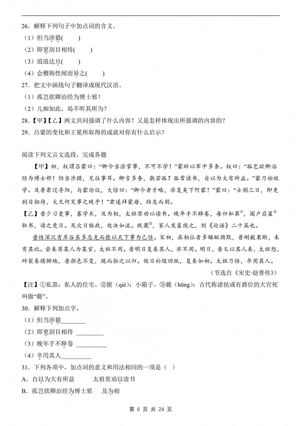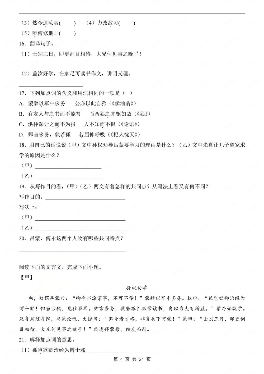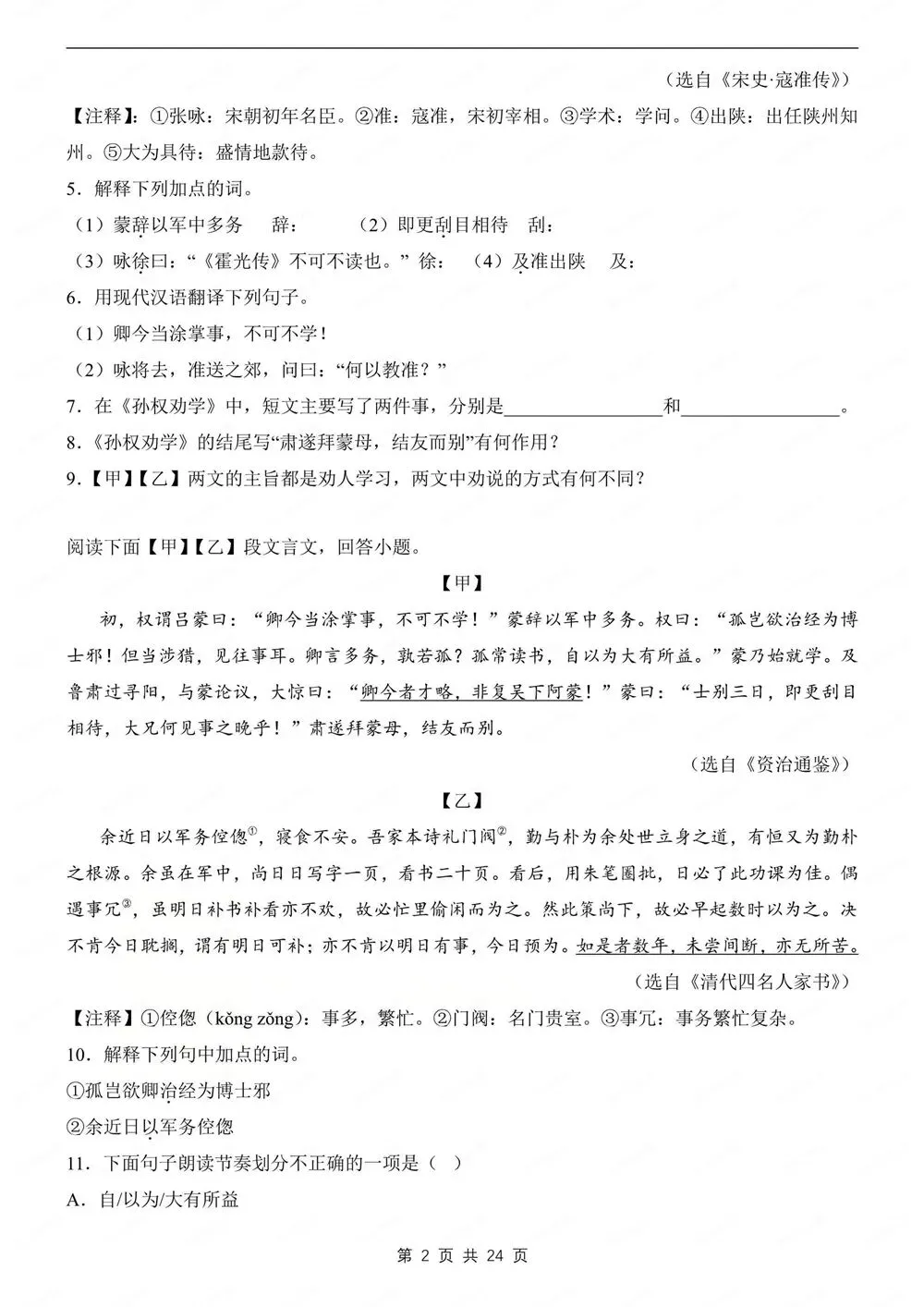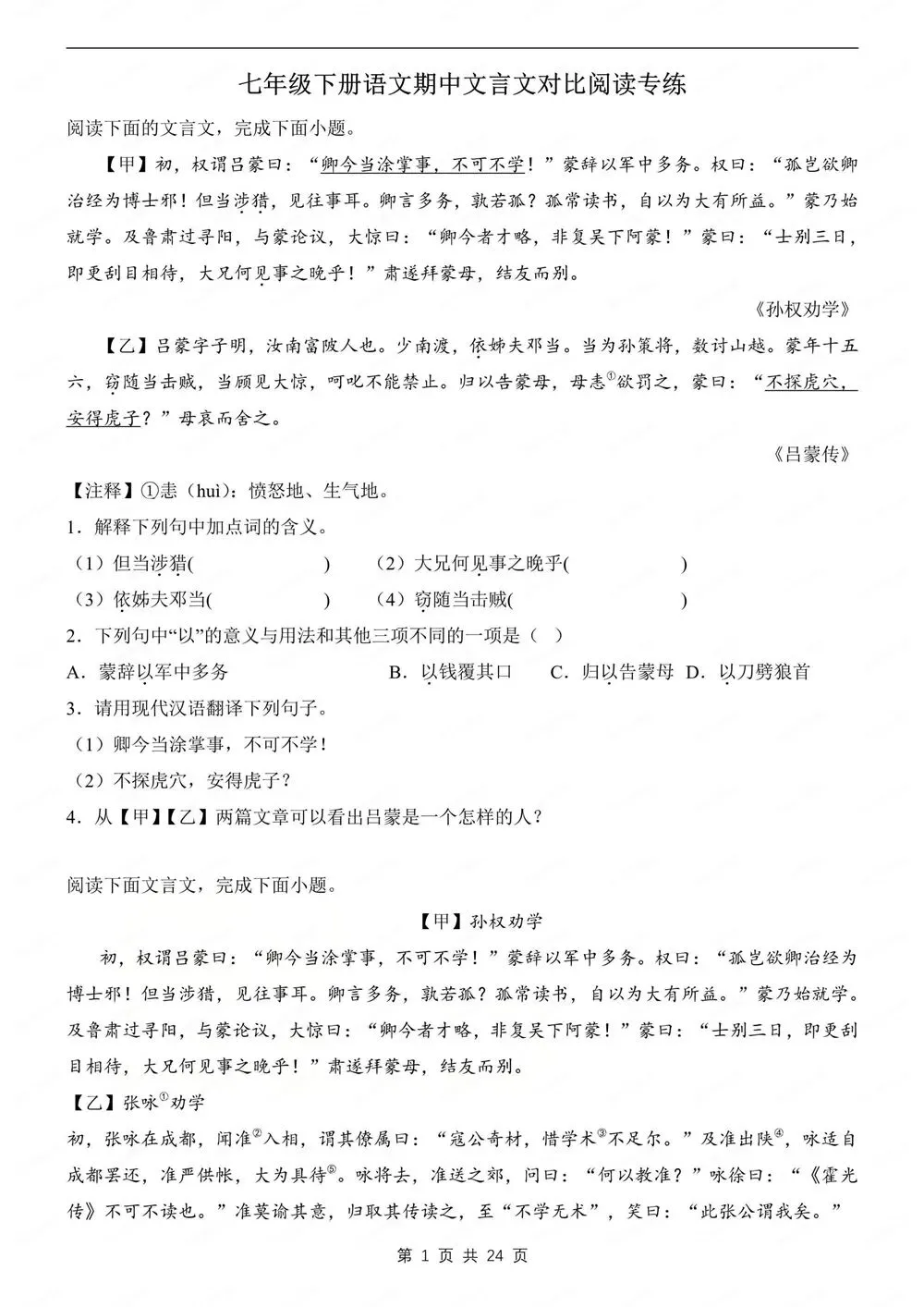期中练习,初中语文七年级下新教材初一下册,文言文对比阅读练习,CYWH260268,