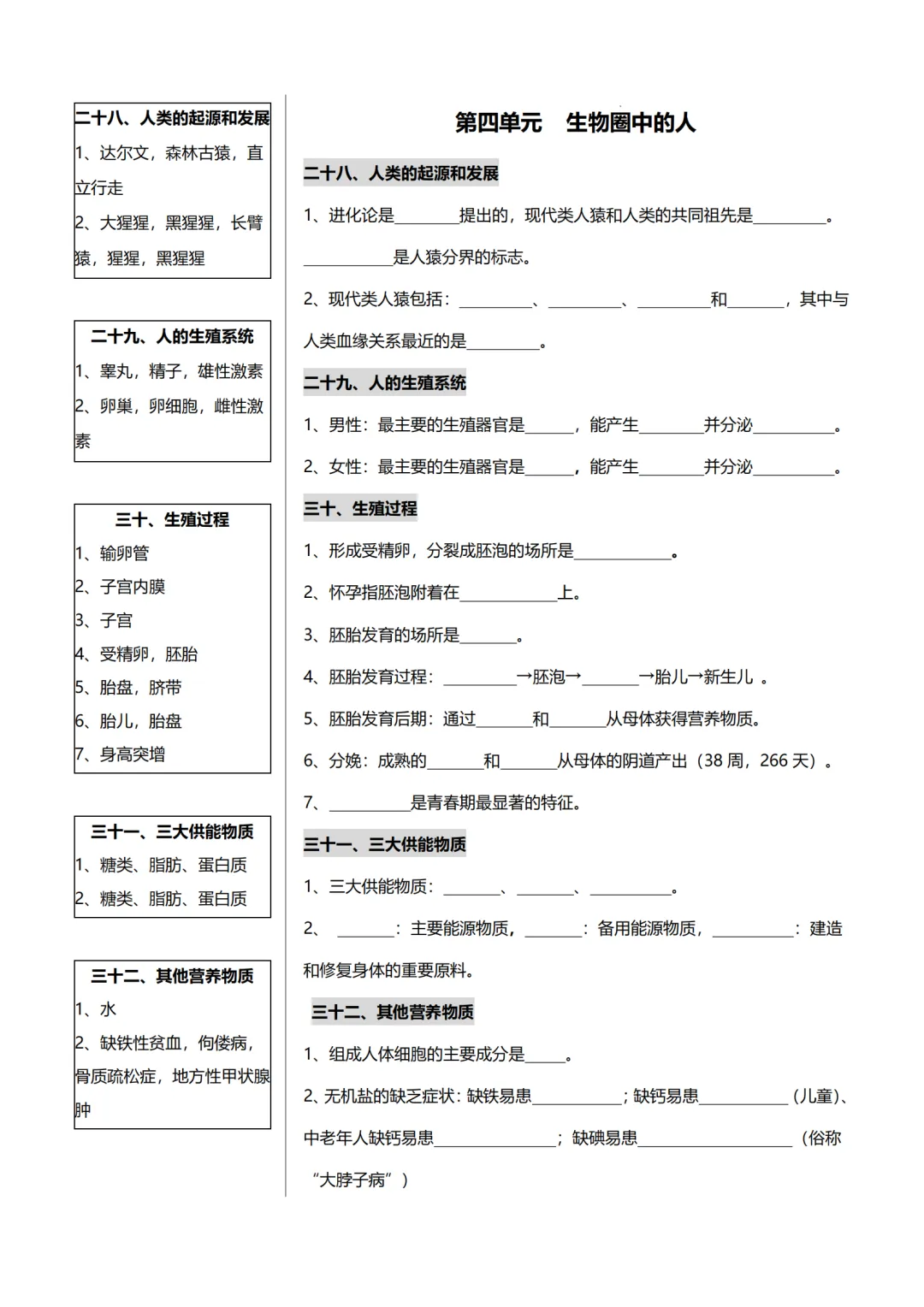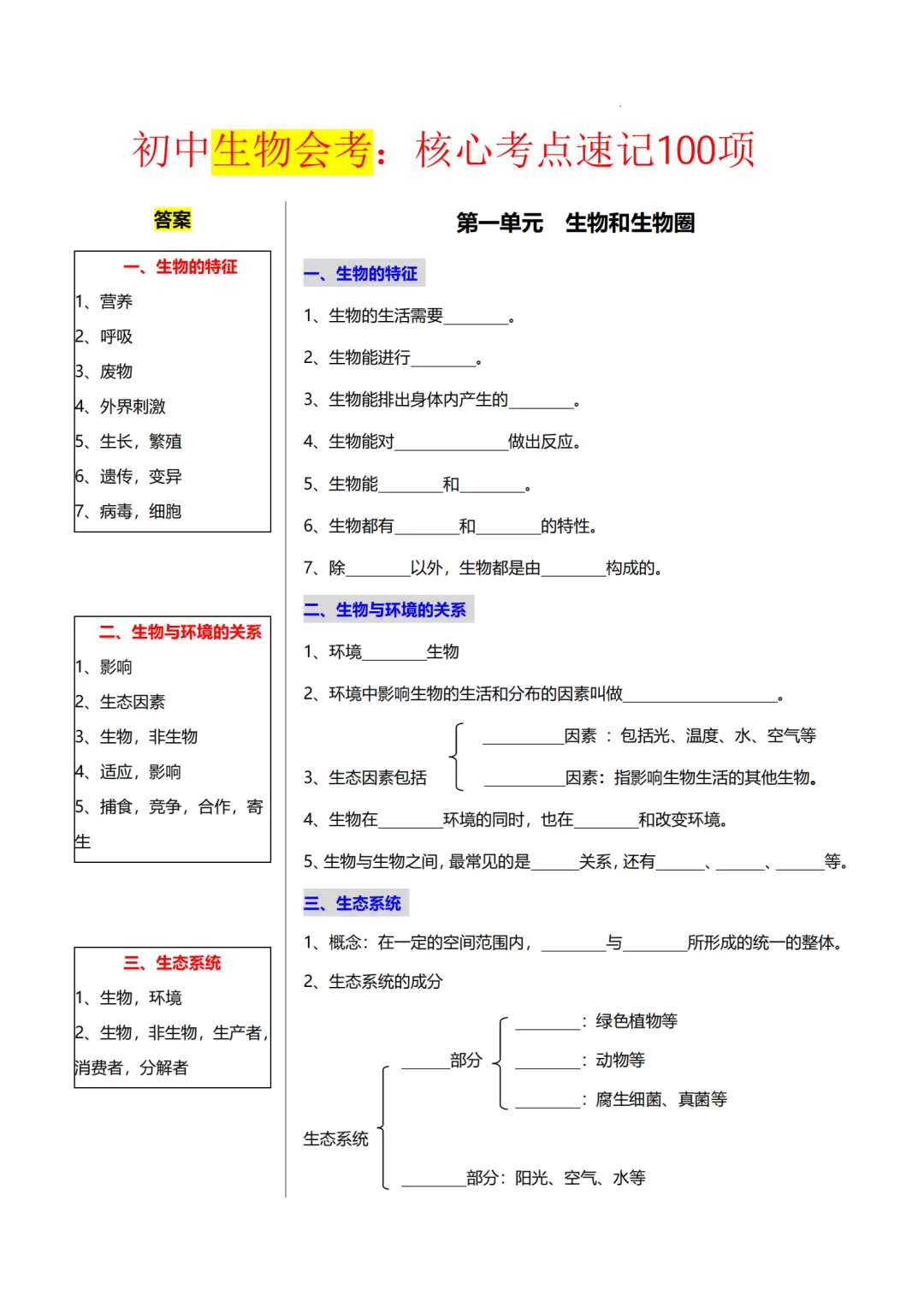 >【新版本】新教材 2026 初中生物会考复习核心考点知识速记清单,电子版可打印!