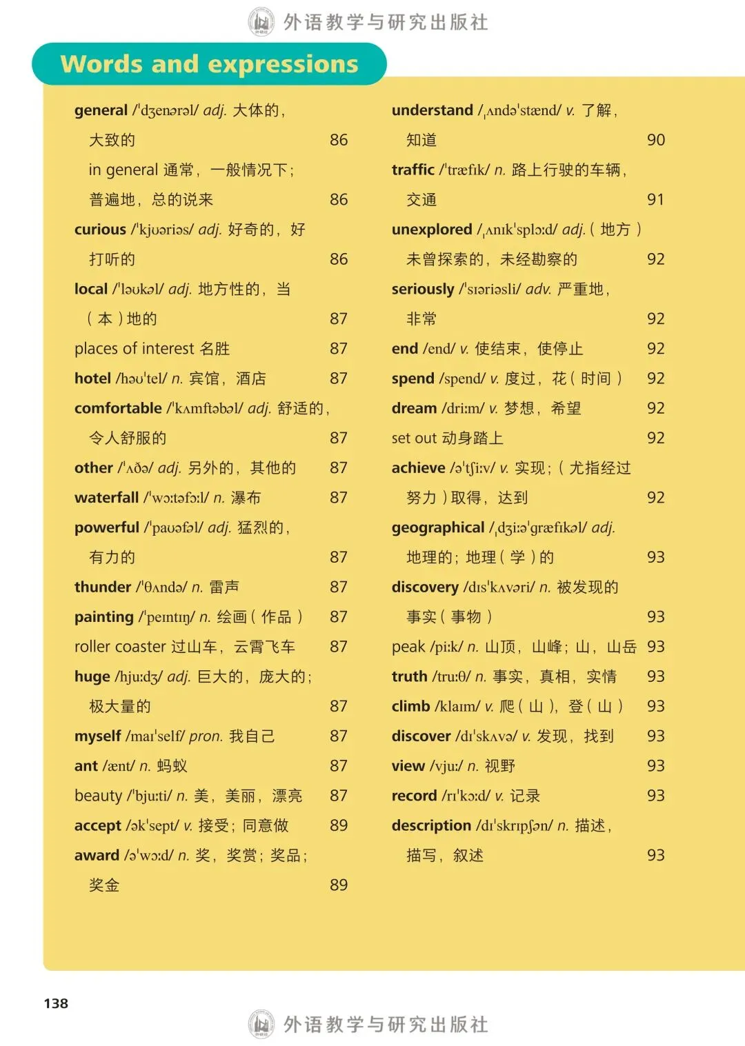 1、direction /dəˈrekʃn/ n. 方向2、turn left /tɜːn/ phr. 向左转3、turn right /raɪt/ phr. 向右转4、across /əˈkrɒs/ prep. 穿过5、between /bɪˈtwiːn/ prep. 在之间6、next to phr. 紧挨着7、market /ˈmɑːkɪt/ n. 市场8、bank /bæŋk/ n. 银行9、restaurant /ˈrestrɒnt/ n. 餐馆10、hospital /ˈhɒspɪtl/ n. 医院11、police station phr. 警察局12、weather /ˈweðə(r)/ n. 天气13、sunny /ˈsʌni/ adj. 晴朗的14、rainy /ˈreɪni/ adj. 多雨的15、cloudy /ˈklaʊdi/ adj. 多云的16、windy /ˈwɪndi/ adj. 有风的17、season /ˈsiːzn/ n. 季节18、spring /sprɪŋ/ n. 春天19、summer /ˈsʌmə(r)/ n. 夏天20、autumn /ˈɔːtəm/ n. 秋天21、winter /ˈwɪntə(r)/ n. 冬天22、travel /ˈtrævl/ v. 旅行23、journey /ˈdʒɜːni/ n. 旅行24、ticket /ˈtɪkɪt/ n. 票25、station /ˈsteɪʃn/ n. 车站26、arrive /əˈraɪv/ v. 到达27、leave /liːv/ v. 离开28、wait for phr. 等待29、enjoy /ɪnˈdʒɔɪ/ v. 喜欢30、take a walk phr. 散步