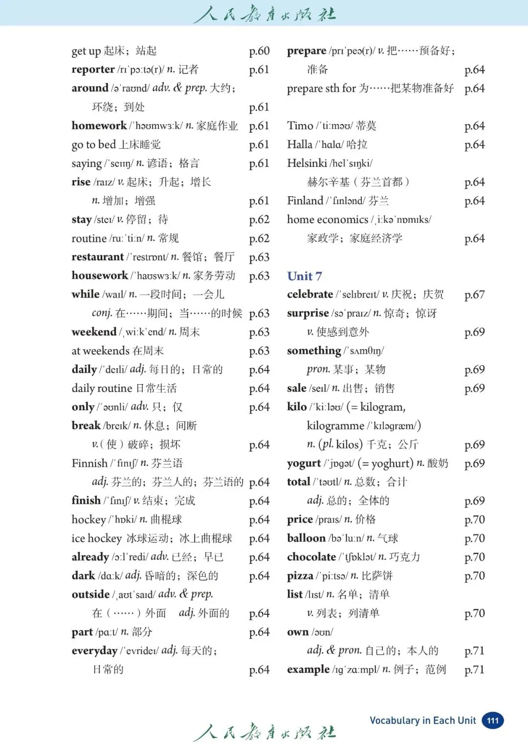1、name /neɪm/ n. 名字2、family /ˈfæməli/ n. 家庭3、friend /frend/ n. 朋友4、teacher /ˈtiːtʃə(r)/ n. 老师5、student /ˈstjuːdənt/ n. 学生6、number /ˈnʌmbə(r)/ n. 数字7、telephone /ˈtelɪfəʊn/ n. 电话8、school /skuːl/ n. 学校9、subject /ˈsʌbdʒɪkt/ n. 学科10、favorite /ˈfeɪvərɪt/ adj. 最喜欢的11、because /bɪˈkɒz/ conj. 因为12、interesting /ˈɪntrəstɪŋ/ adj. 有趣的13、difficult /ˈdɪfɪkəlt/ adj. 困难的14、busy /ˈbɪzi/ adj. 忙碌的15、food /fuːd/ n. 食物16、fruit /fruːt/ n. 水果17、vegetable /ˈvedʒtəbl/ n. 蔬菜18、breakfast /ˈbrekfəst/ n. 早餐19、lunch /lʌntʃ/ n. 午餐20、dinner /ˈdɪnə(r)/ n. 晚餐21、eat /iːt/ v. 吃22、want /wɒnt/ v. 想要23、buy /baɪ/ v. 买24、sell /sel/ v. 卖25、price /praɪs/ n. 价格26、clothes /kləʊðz/ n. 衣服27、store /stɔː(r)/ n. 商店28、play sports 做运动29、have a look 看一看30、after school 放学后