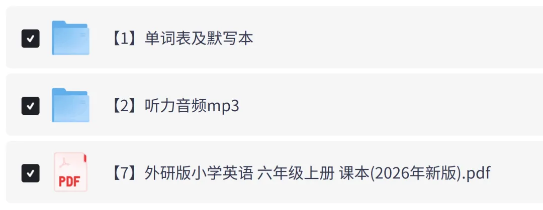 外研社版小学英语六年级上册电子课本教材+单词表+单词默写表+听力音频完整版(2026年新版教材),可下载打印!