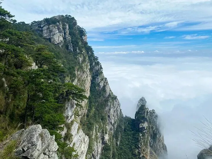 五老峰由并列的五个山峰组成,仰望俨若席地而坐的五位老翁。五个山峰各具特色,一峰到五峰景色各异,攀爬过程中可以欣赏到奇松、怪石、云海等景观。站在五老峰上,视野极为开阔,能俯瞰到鄱阳湖的浩渺烟波和周边的层峦叠嶂,让人感受到大自然的雄伟与壮观。