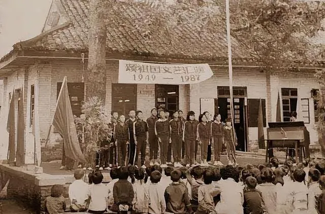 80年代农村小学的场面,墙是青砖砌的,窗户透风,课桌全拼手工做出来的,门口光秃秃一排杨树,早上上学刚到,排队打闹着进屋,冬天课间钻阳光里搓手,春天坐椅子上背课文,后面老屋顶接雨水下来砸下泥点子,墙头贴着大红标语,孩子们的书包都是织布的,桌上没几个新文具,但谁也不觉得缺啥。