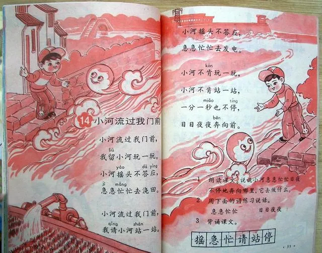 课本第十三课春风吹,画里孩子围着桃树团团转,手上拎着小铁桶,桃花开得太实在,连花瓣都不舍得画虚了,低头栽菜的举着小铲子,几个男孩袖子捋到胳膊肘,嘴角还叼着草梗,念出来的诗句“春风吹,春风轻轻地吹”,一口气读下来就觉得耳边真有动静,那种安稳劲儿,搁现在的教辅书里可不见得找得到。