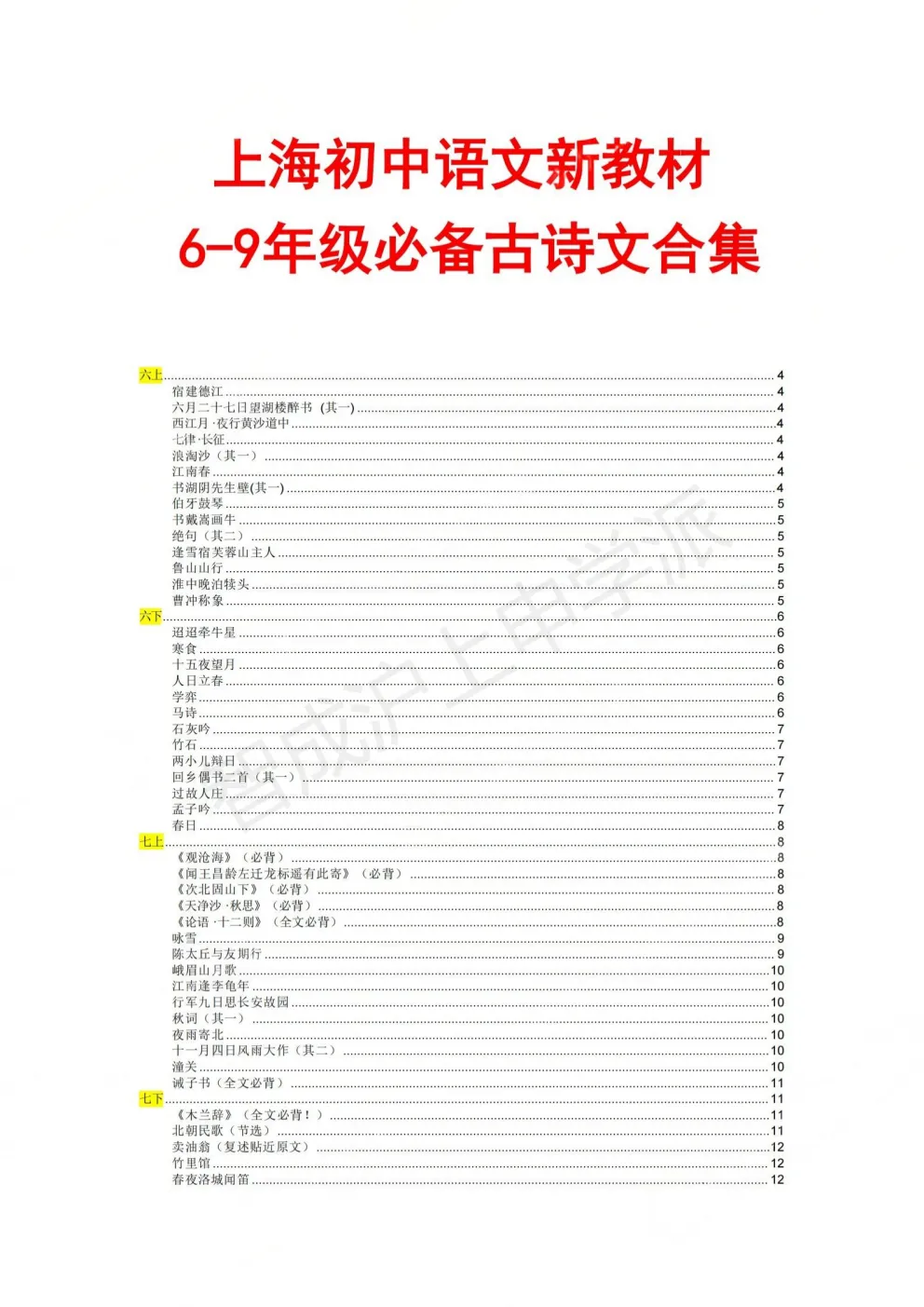 今天给大家分享的是上海初中6-9年级语文必背古诗文142篇,覆盖课内精读、课外诵读、中考高频名句,从六年级打好基础,到九年级冲刺高分,一套资料全程够用,让孩子背诵有方向、备考不迷茫!