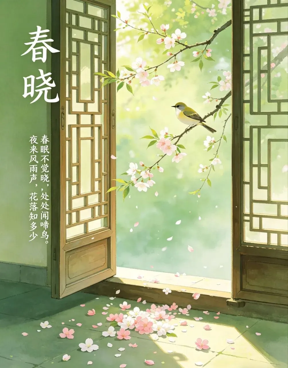 解释:春日里贪睡,不知不觉天就亮了,到处都能听见鸟儿的鸣叫。想起昨夜传来阵阵风雨的声音,不知道枝头的花儿被吹落了多少。